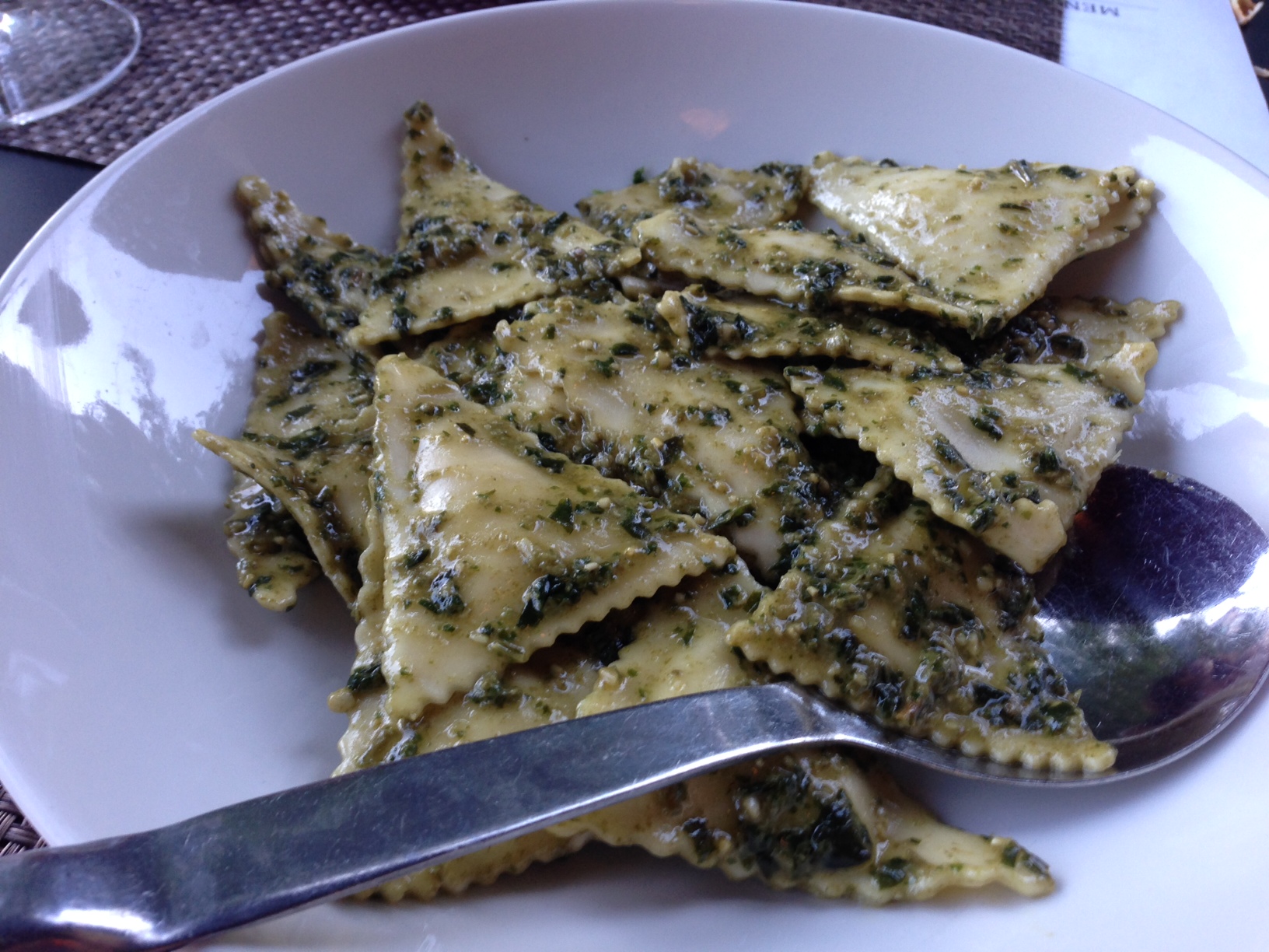 The last pasta presented is triangles stuffed with gorgonzola cheese and pear. It comes with a pesto sauce.