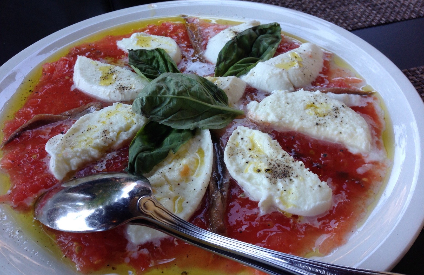Eating on the patio on a rare, cool summer night, we start off with an interesting take on the caprese salad. Instead of sliced tomatoes, the tomatoes are chopped. I especially enjoy the hunks of mozzarella cheese.
