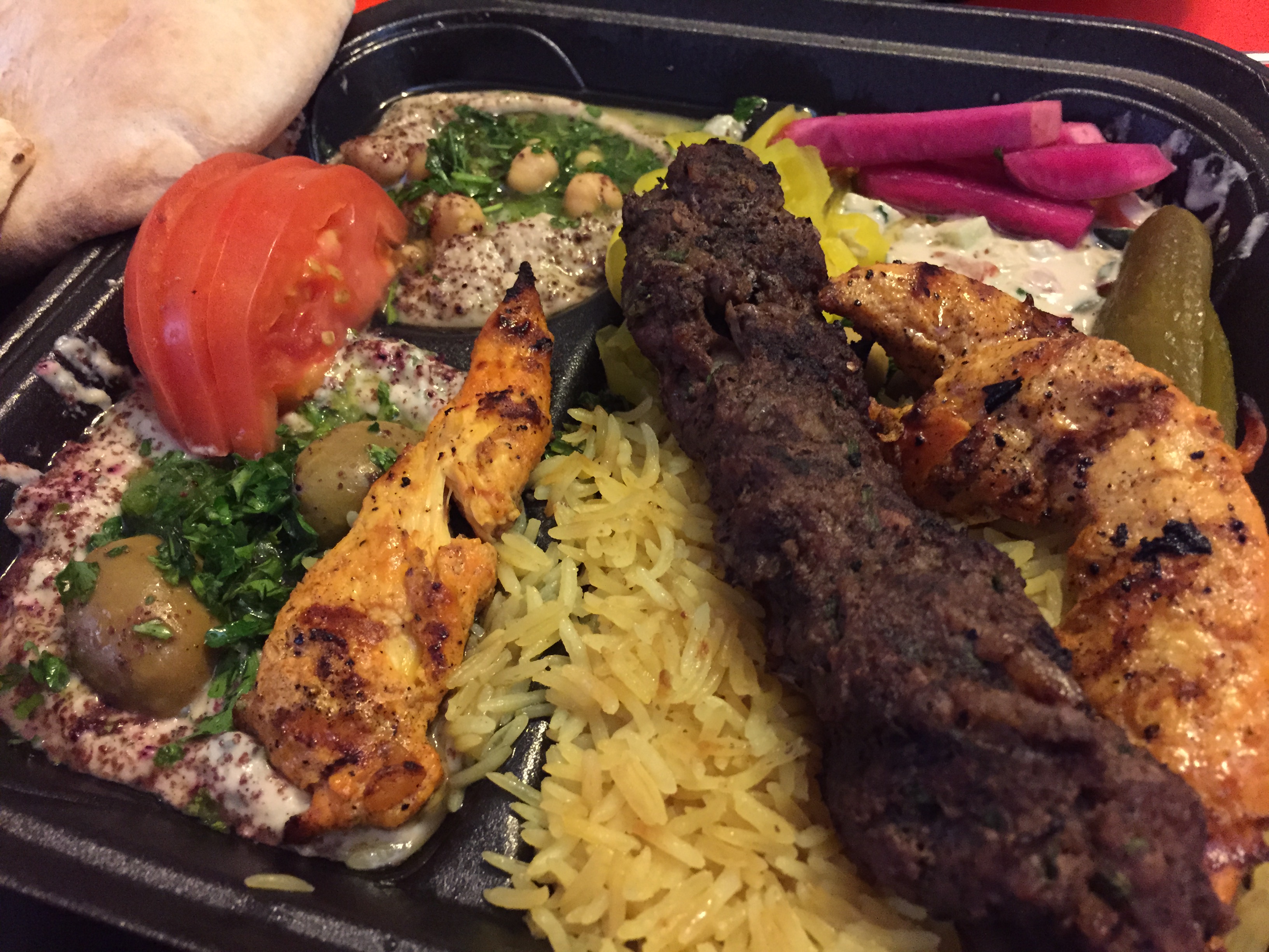 It adds some shish tawook (chicken) and kufta kabob (lamb) to go with more hummus and falafel. The chicken and lamb are made when you order. It’s fresh, hot, and tasty.