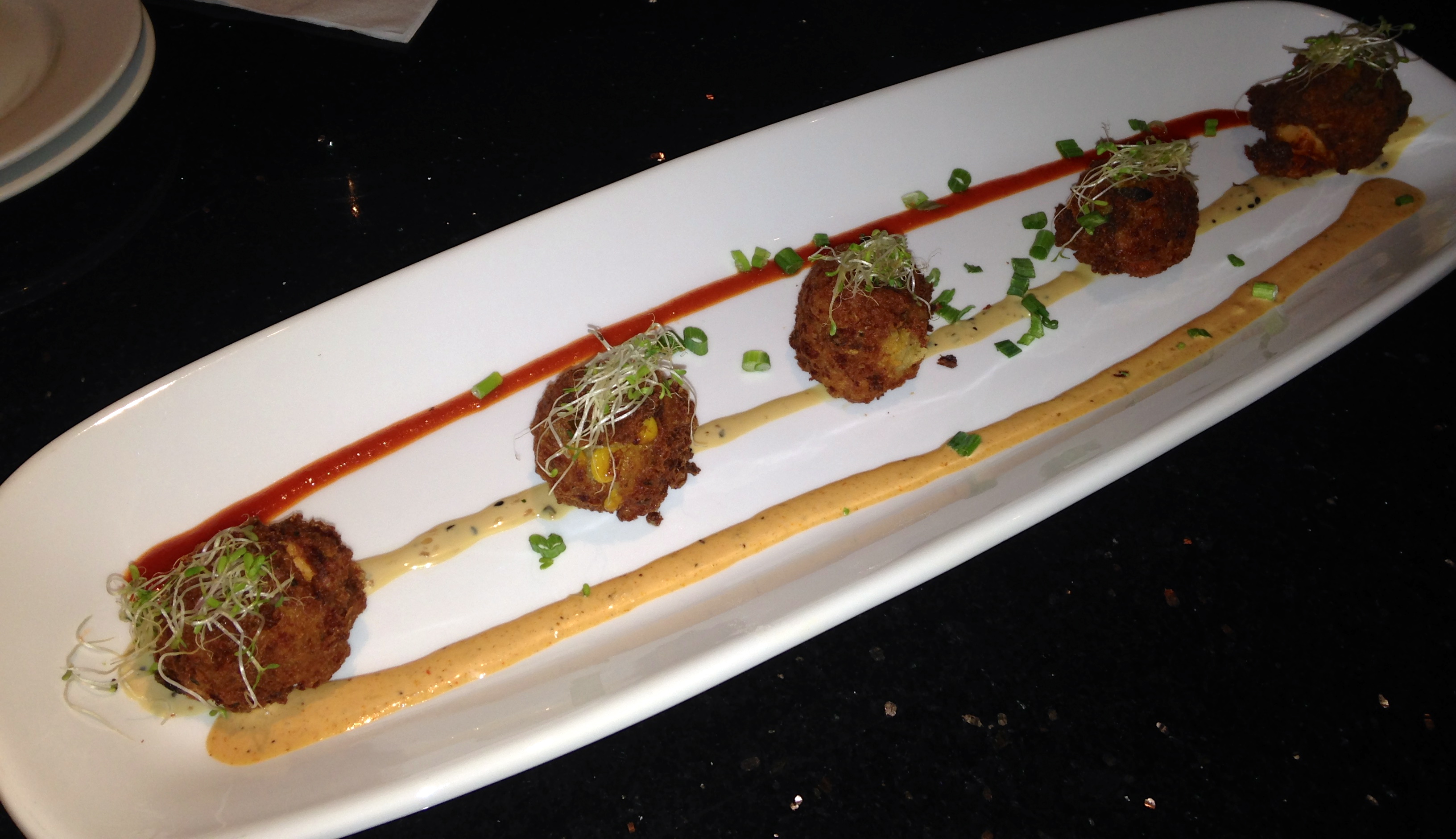 Not only is this a unique appetizer, it’s one of the best we have had in a long time. We highly recommend this dish if you visit. It’s like an orbit-shaped crab cake with salmon. There are three sauces on the plate, ginger, mustard, and sirracha. As you can imagine, each brings a different taste.