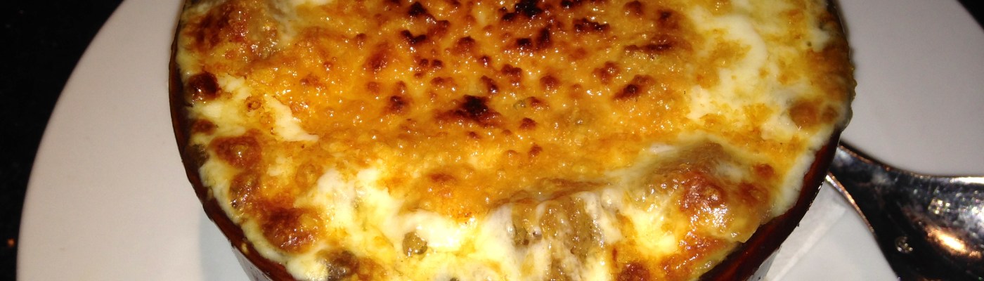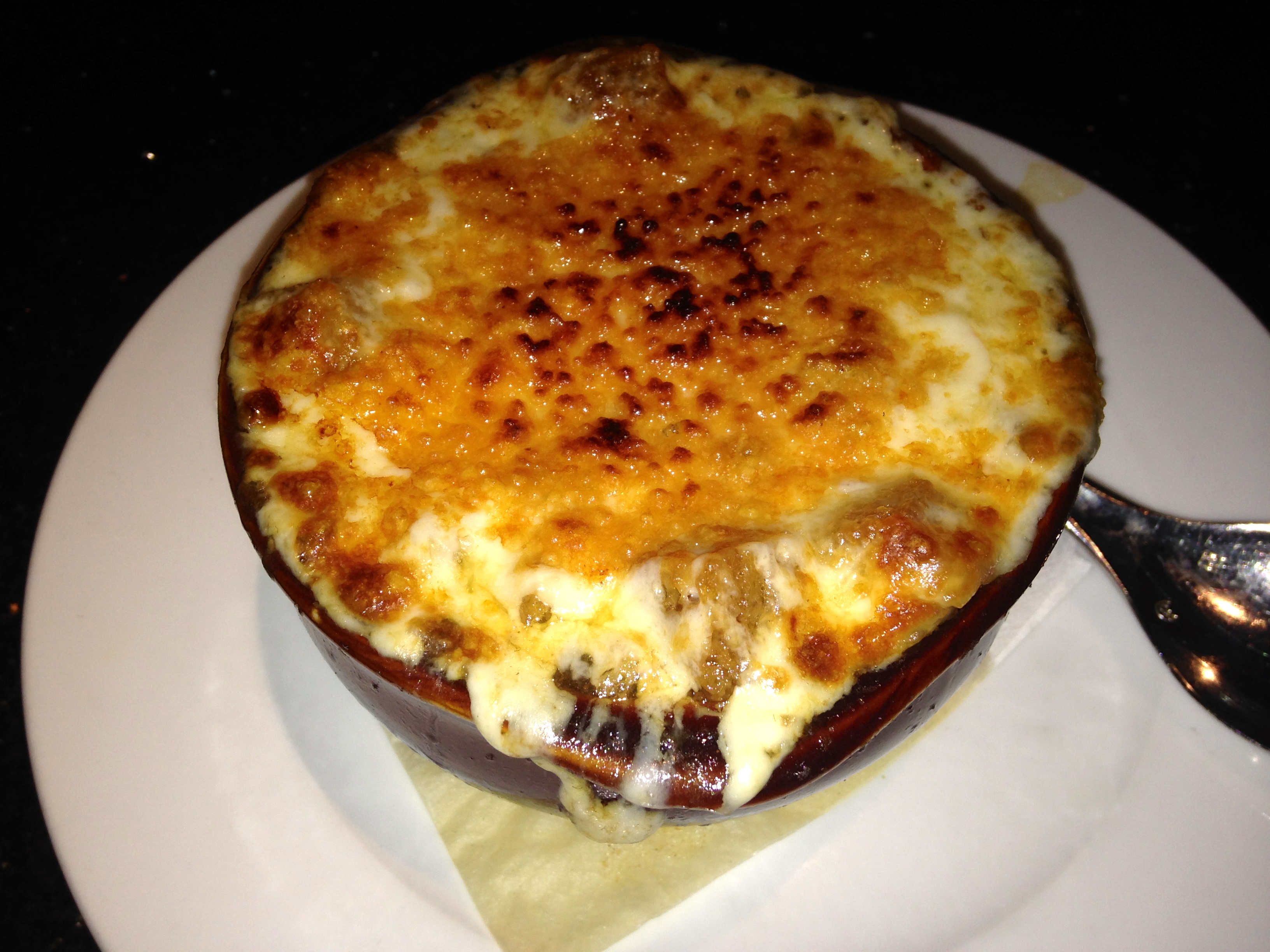 Our waiter goes gaga over the onion soup, which we feel will warm us up tonight.