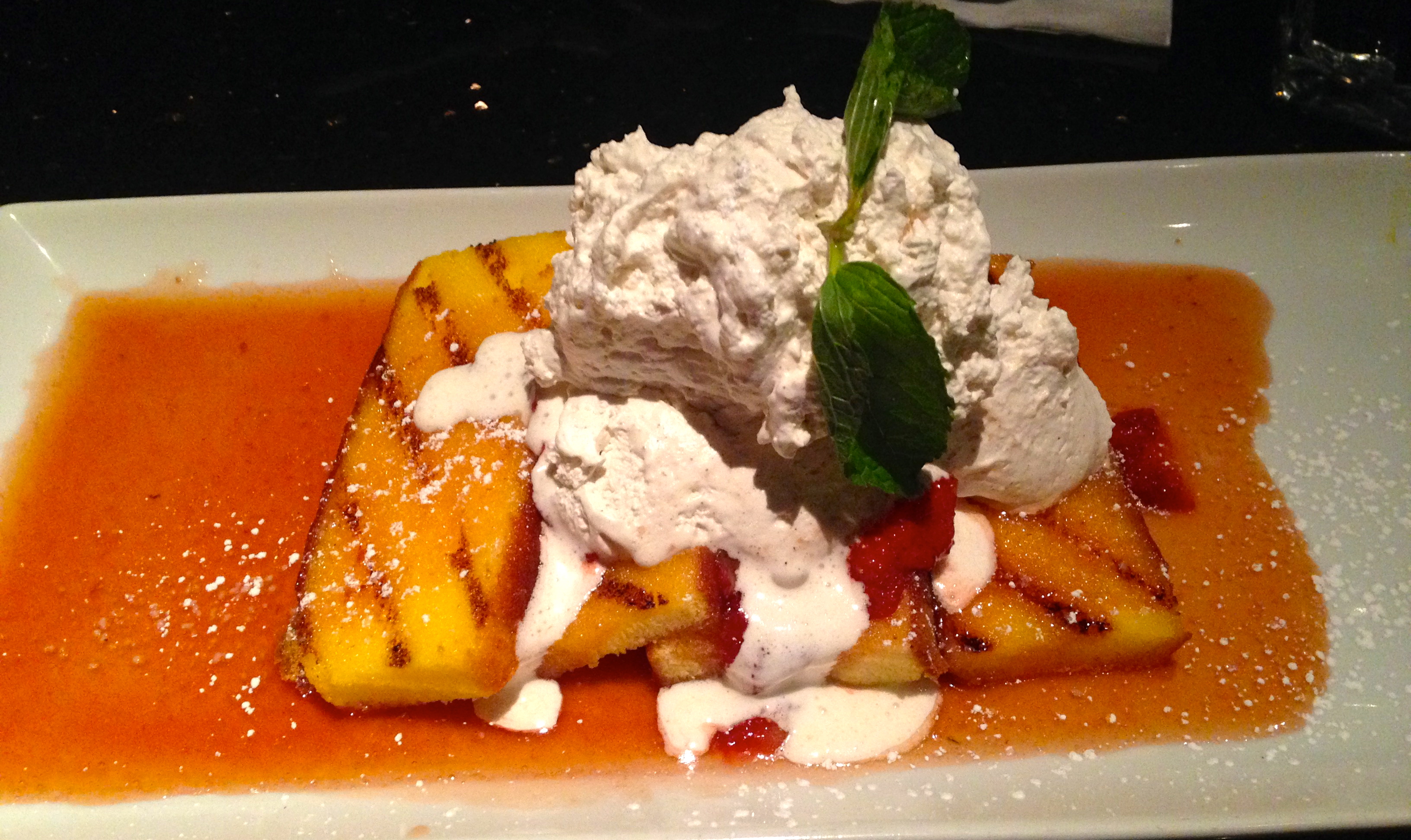 The strawberry shortcake Fosters features grilled pound cake topped with fresh strawberries and homemade cinnamon whipped cream. Although we really enjoy this dessert, they should have called it “shortcake Fosters” as there were hardly any strawberries on the pound cake. We don’t seem to mind, though, as we try to lick the rum and brown sugar sauce off of the plate.