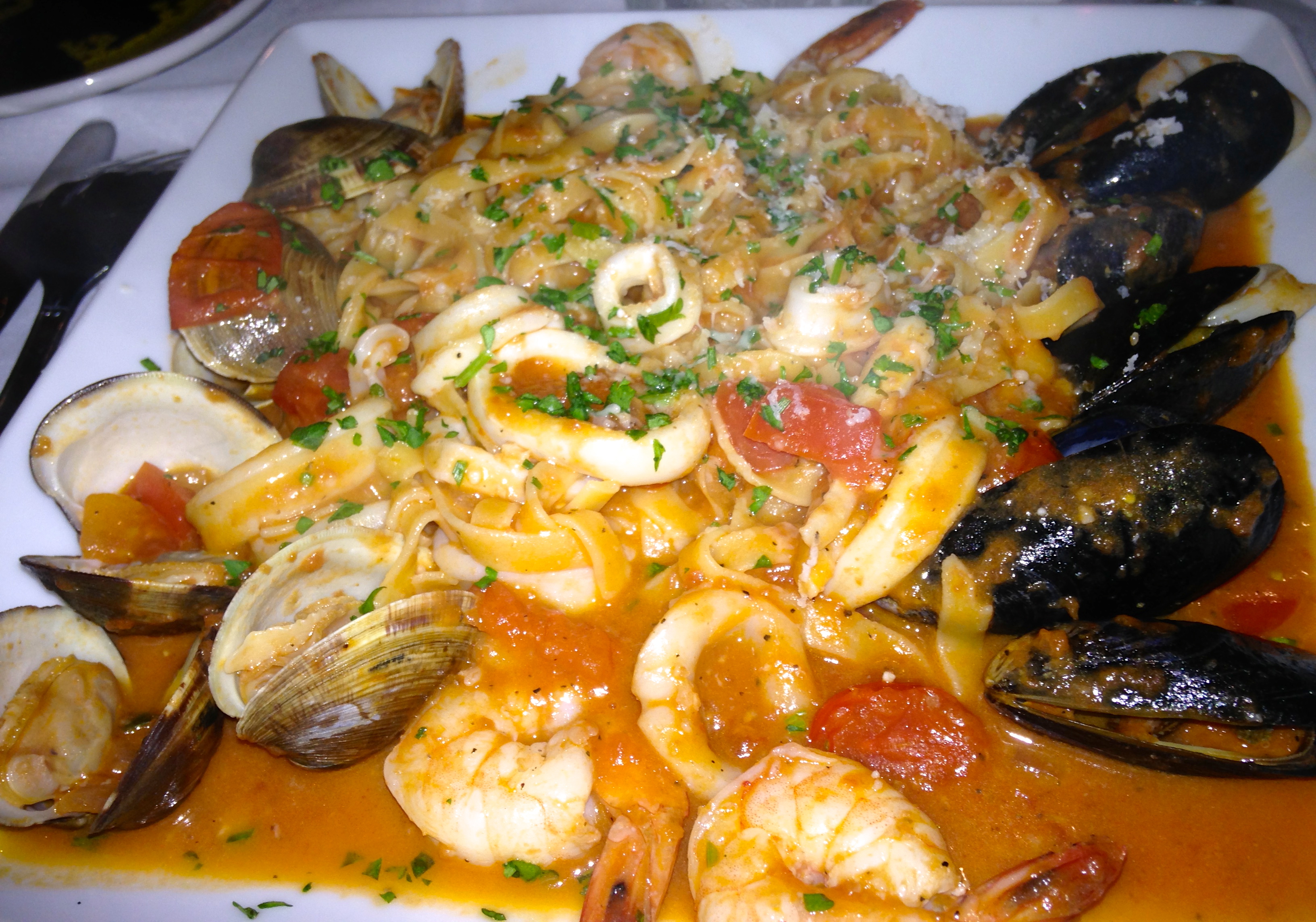 The huge portion of house-made pasta comes with mussels, clams, shrimp, and calamari in a red sauce, or a white wine sauce if you prefer. Somehow or another, I finish the whole plate. I do consider licking the plate, but alas, I am stuffed.