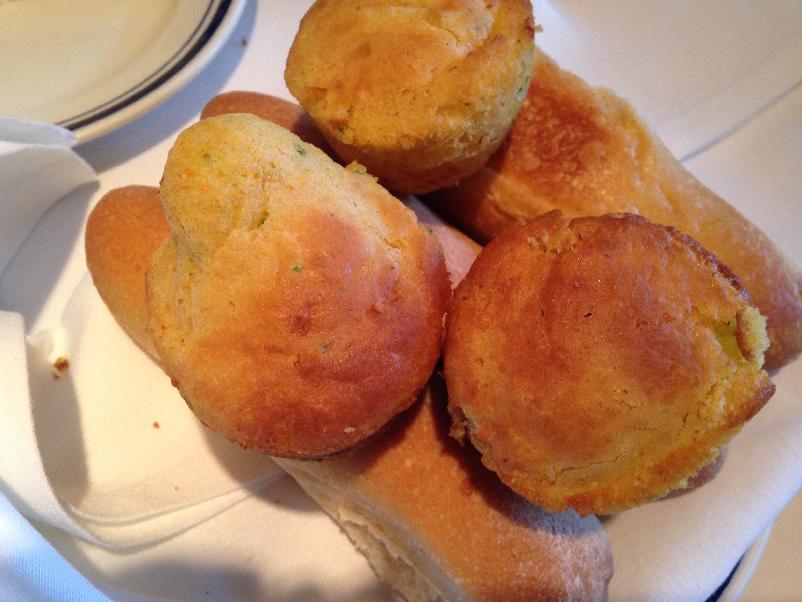 The kitchen is open and across from the bar. It’s a busy place. They start you off with cornbread muffins and bread.