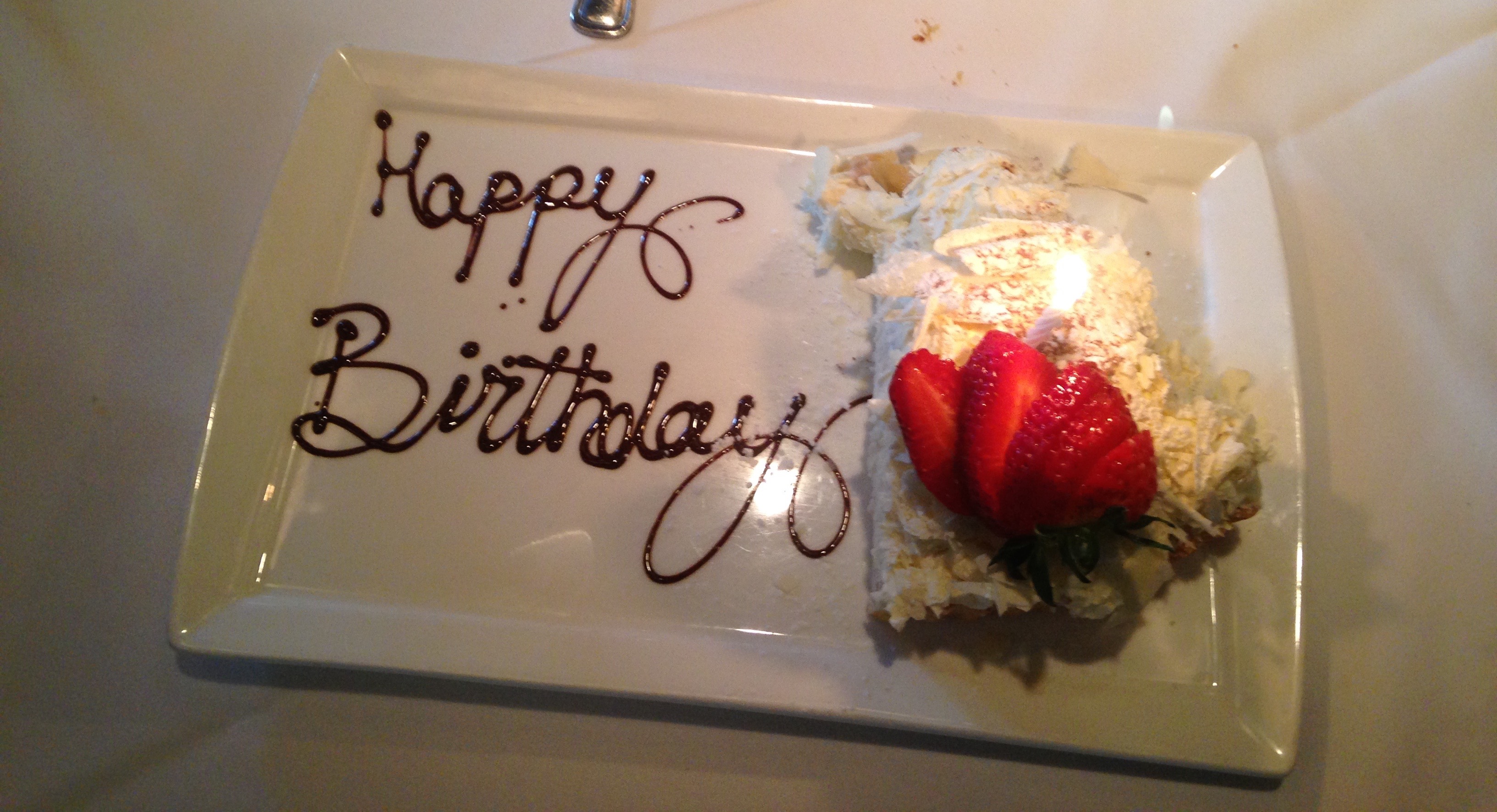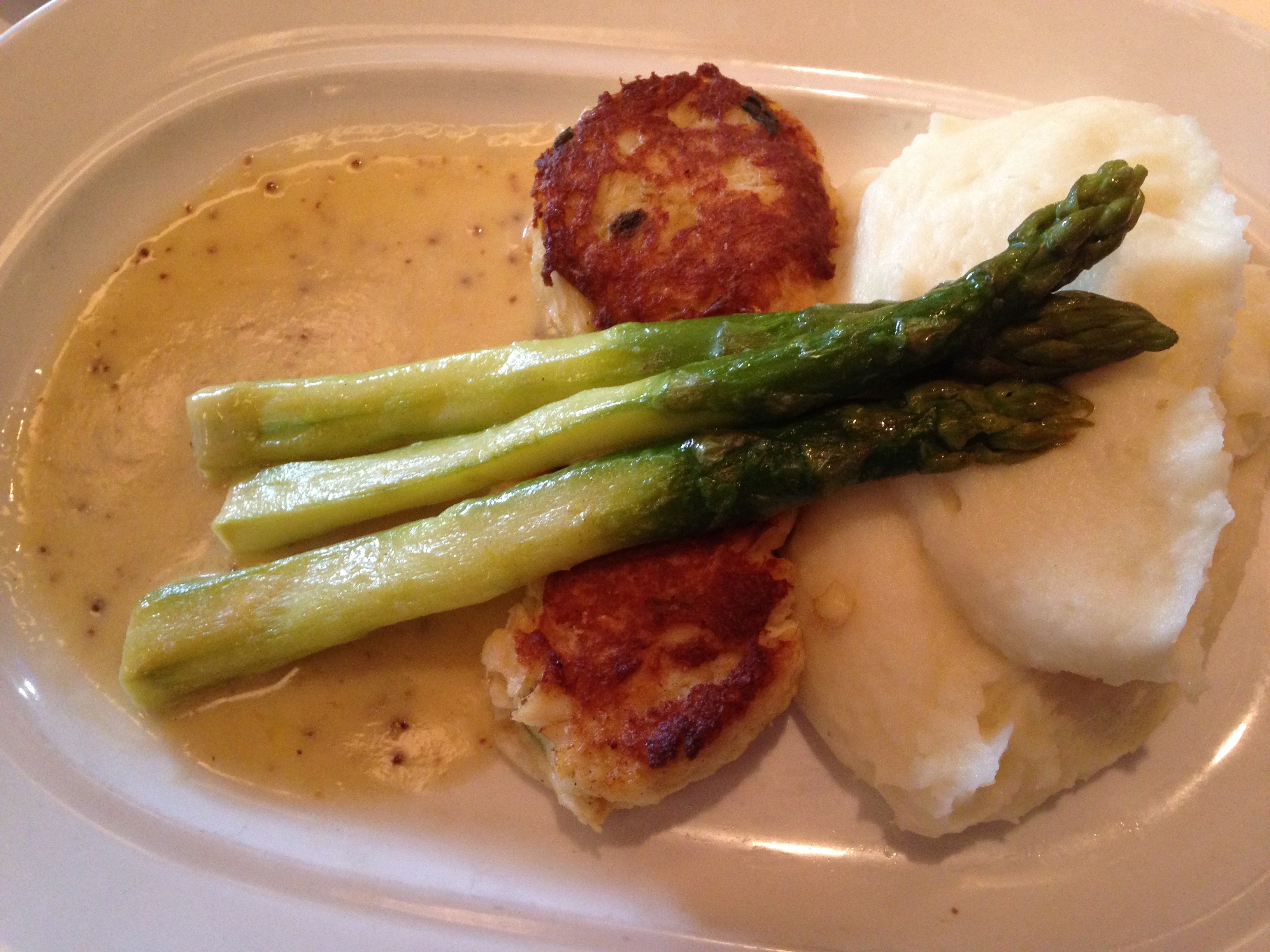 There are five of us at the table and evidently, we are in a “salad” mood. Four of us must have eaten too much this week and go for the green stuff. The birthday boy gets crab cakes.