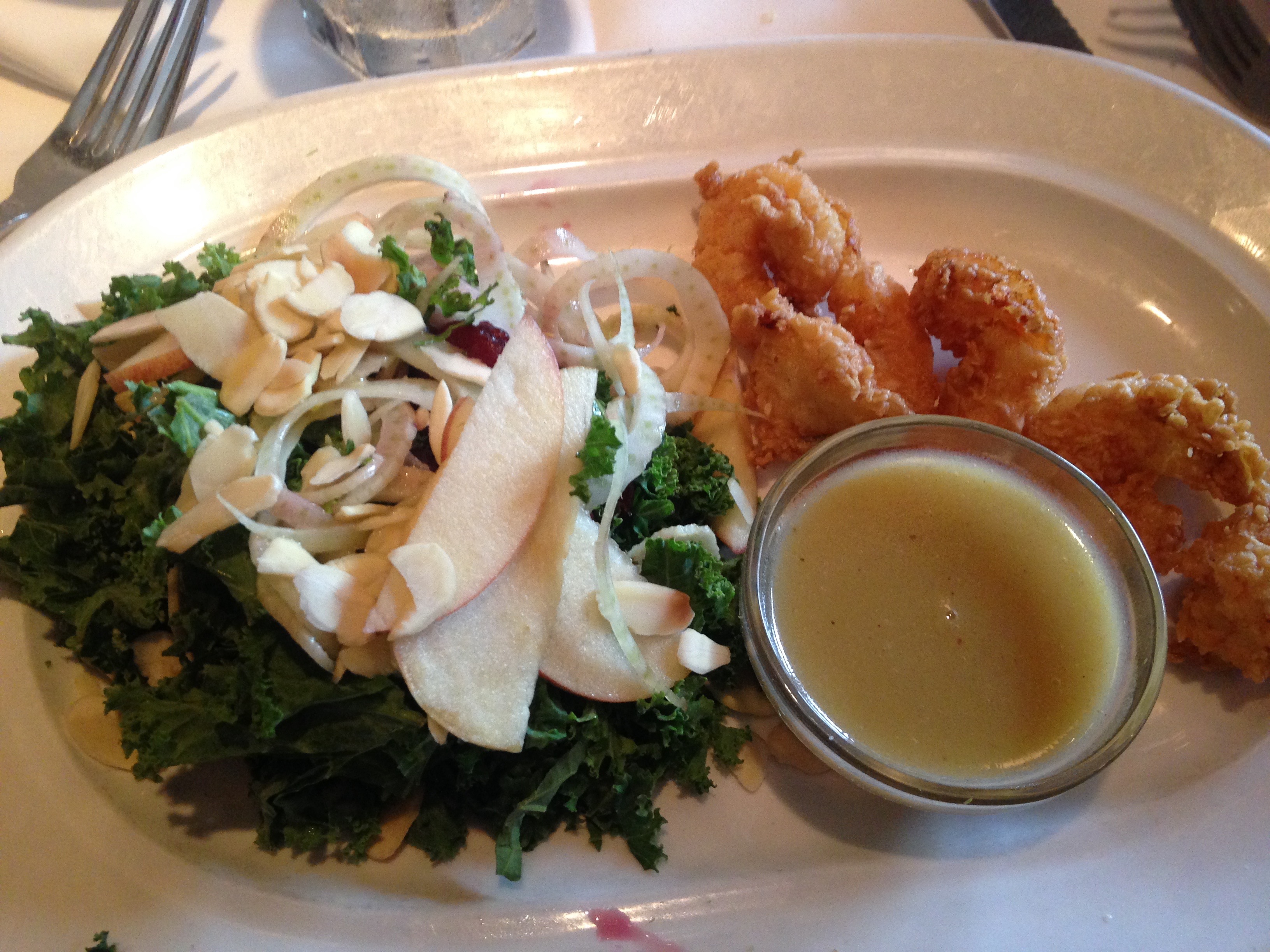 This greenery comes from the “big entree salads” part of the menu. You can have shrimp, chicken or salmon with your kale. Eve gets the fried shrimp. The shrimp are small and crunchy and add a lot to the salad. Maybe there should have been a few more as the portion looked kind of paltry.
