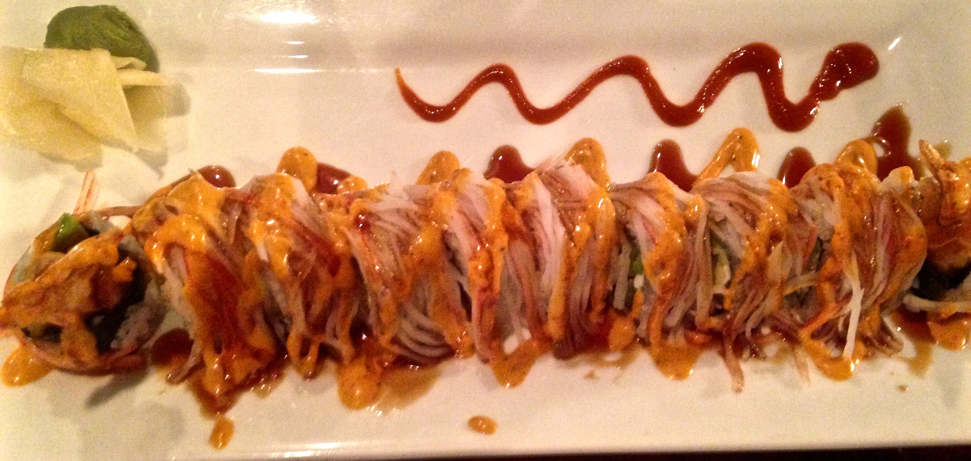 At first the sushi seems out of place on this menu, but someone in the kitchen can certainly roll’em with the best of them. Ours comes with tempura shrimp, avocado, crab and cream cheese, all topped with a spicy mayo. It’s sort of like a party of flavors exploding in our mouths! It’s a generous sized roll, perfect for sharing.
