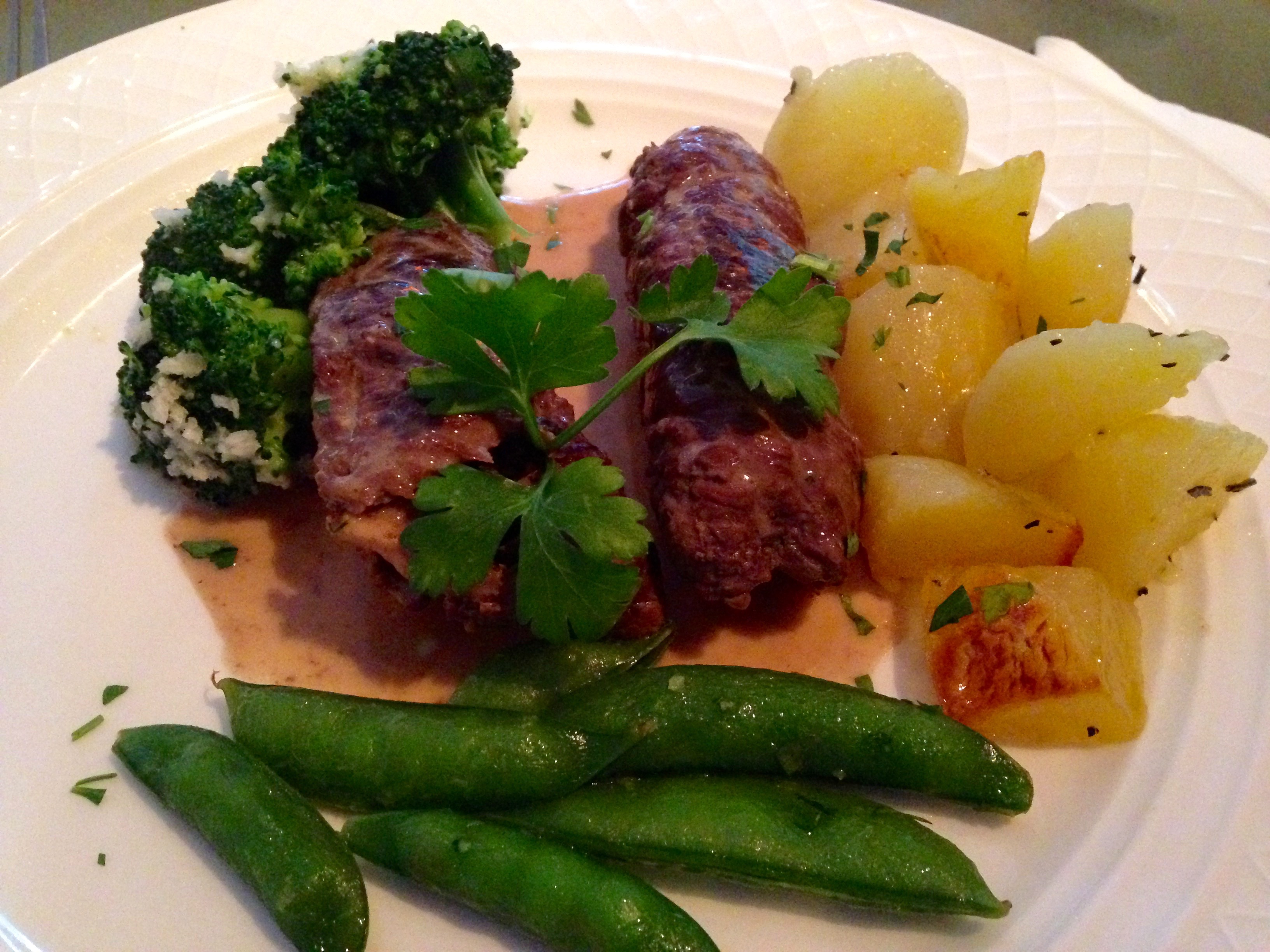 It’s chicken scaloppini with the same sides of potatoes, broccoli and snap beans that are on my plate. It’s thin, flavorful, and masterfully prepared by Chef Maria.