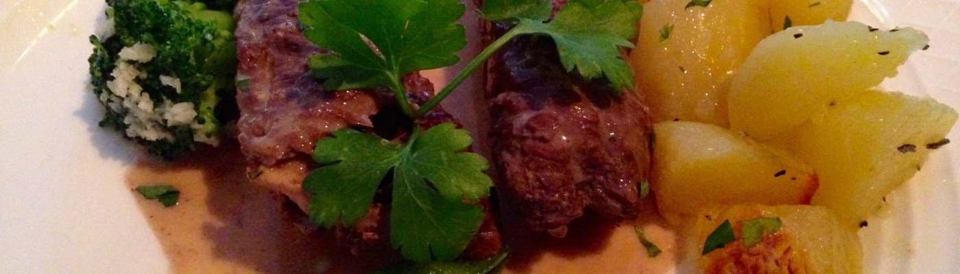 The rotoli di manzo is chuck roast stuffed with mushrooms and pancetta, then slow-roasted in a red wine sauce. They had me at the sauce. The meat is tender and the dish brings back memories of our Italy trip in 2010. Eve’s dish is simple, yet elegant.