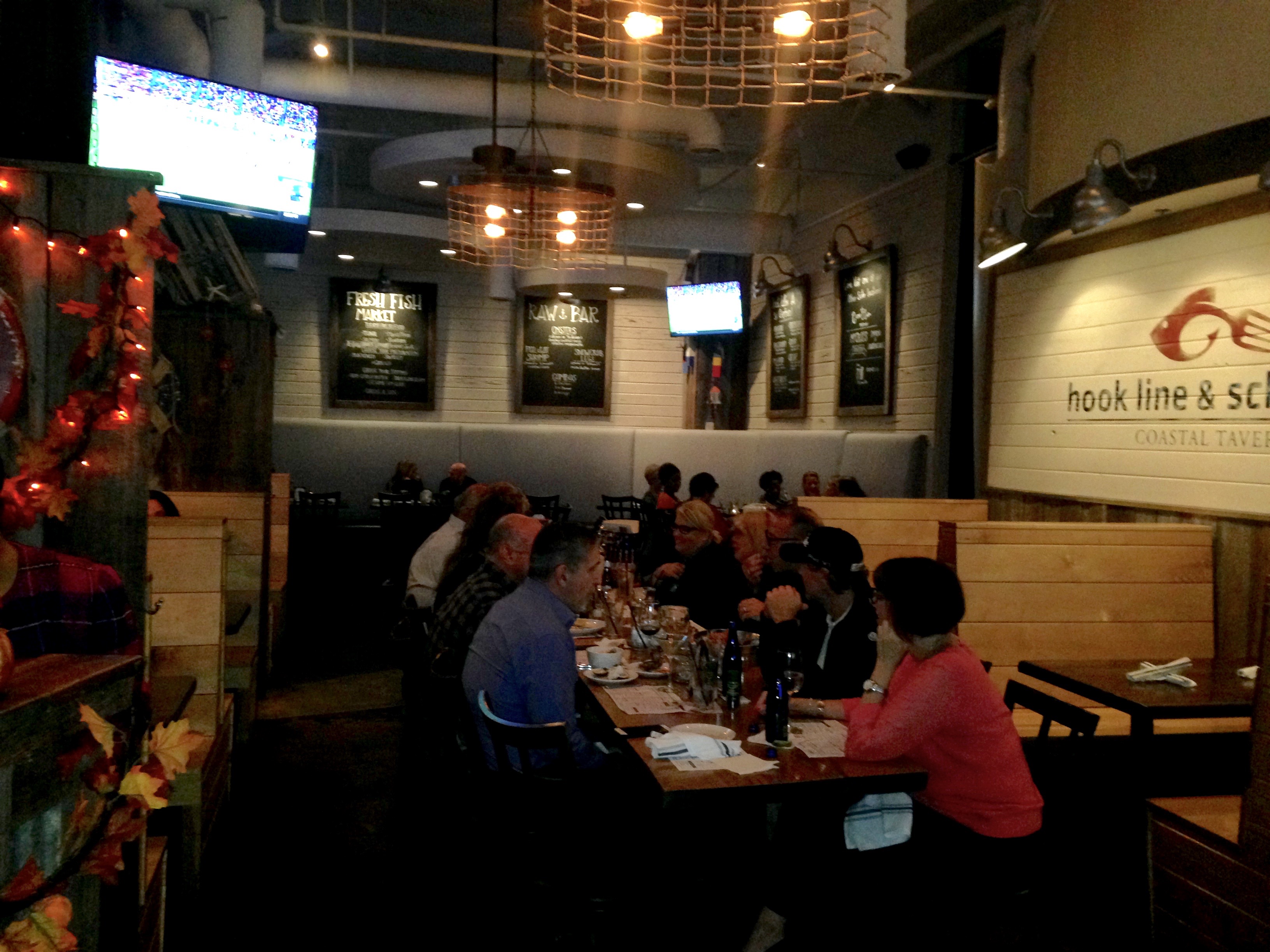 Hook Line and Schooner is the place where Smyrna celebrates. There are three others with my same birthday and large parties at many tables. Let’s start our party with a beer. Sam Adams Octoberfest is the beer of the month. We know this because it’s the first thing we see on the large blackboard at the entrance. Alas, there will be no Sam Adams in our beer schooners tonight as they are out of the beer of the month. I would have erased that beer from the blackboard when it ran out which is why I would not be a good restaurant employee–just sayin’.