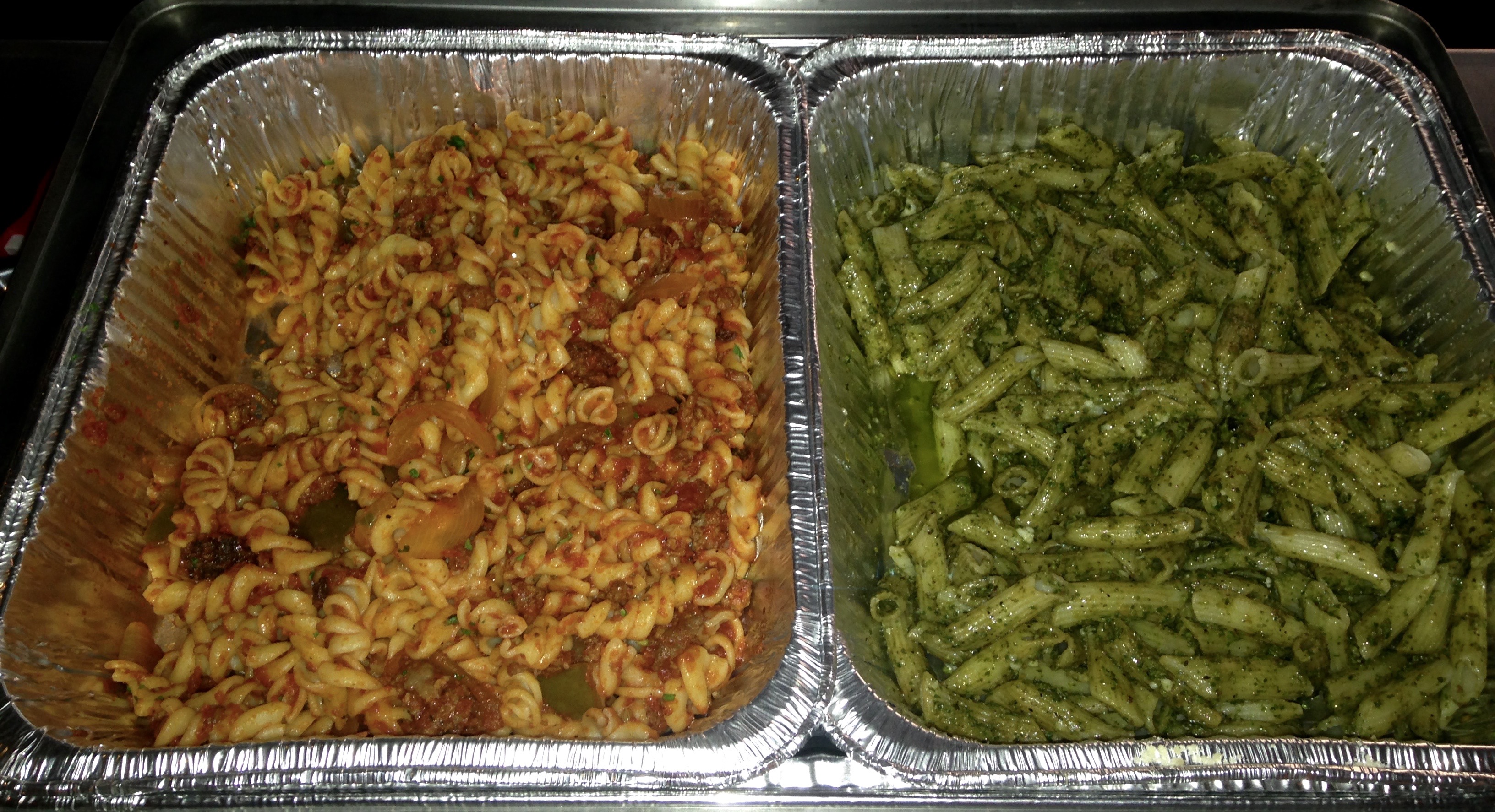 Can you tell which one is the basil pesto pasta? It’s the green one that was full of basil and garlic. Sharing the heating tray is fusilli in a sausage pepper and onion sauce. We are not pepper and onion people and would never order this, but it is nice to try everything. We should probably mention that Figo caters and you can serve all of this food at your next party.