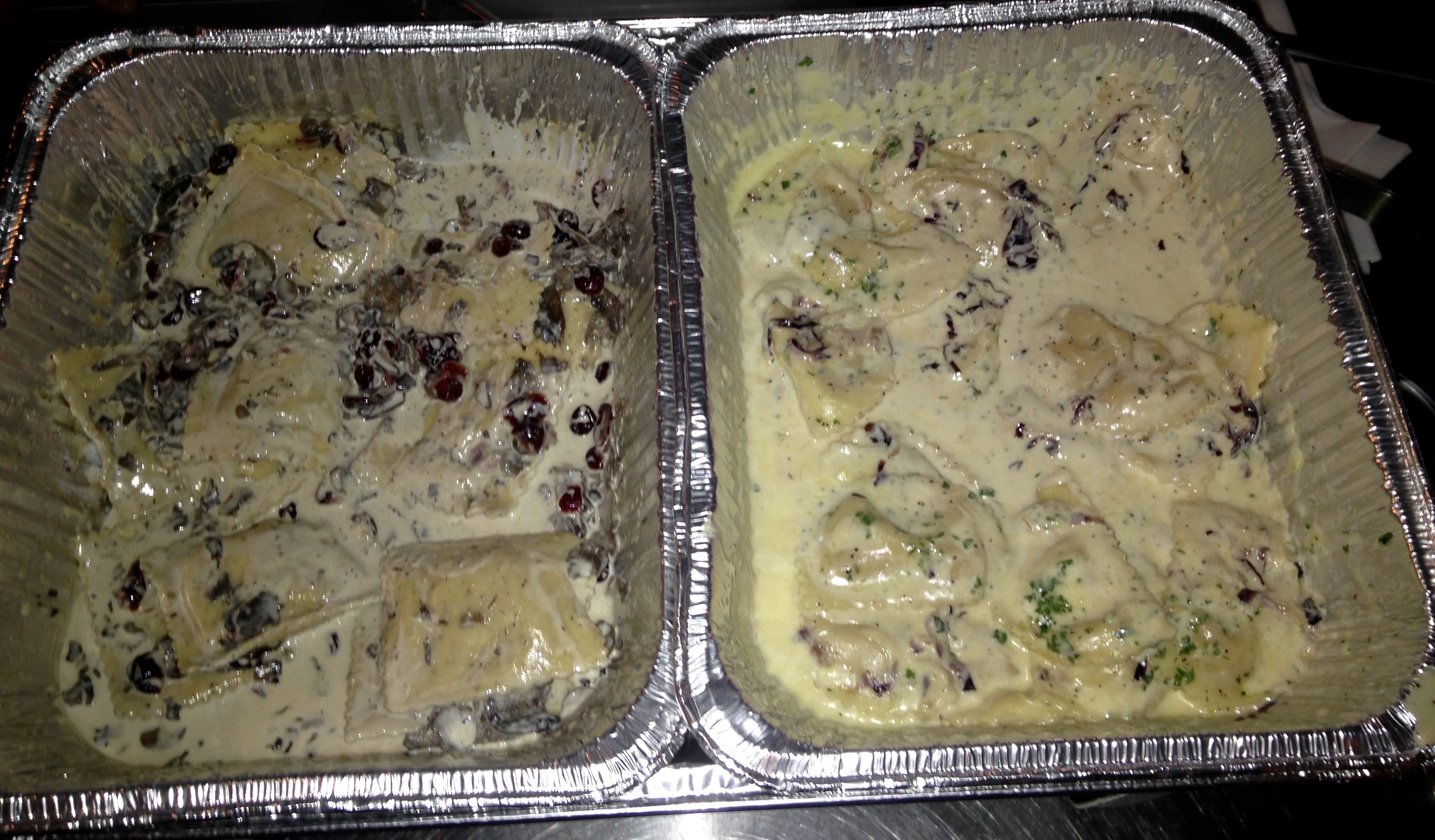 On the left is the turducken ravioli. Just like a real turducken, it has turkey, duck, and chicken for its filling. The mushroom sauce is pretty overpowering and you can’t taste the fillings as well as you can in our second dish. That’s the pumpkin and marscapone cheese ravioli. It reminds us a lot of the famous Figo butternut squash ravioli. Vegetarians should run over while you can to get this dish. It is our favorite of the night. Here’s our other two choices.