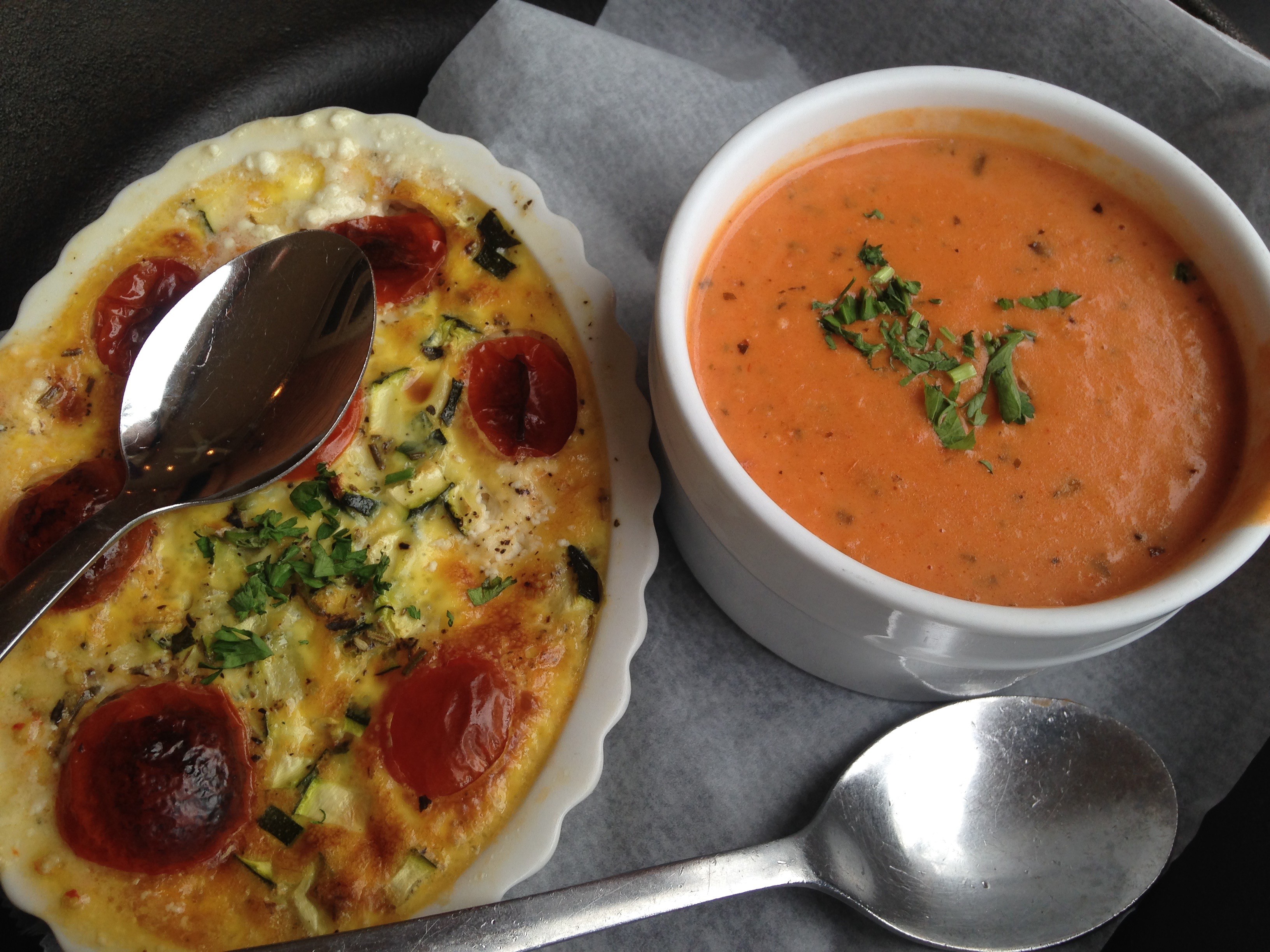 It all looks so fantastic that it’s difficult to choose. My lunch date, JoAnn, picks the Clafoutis Provencal with the tomato bisque soup.