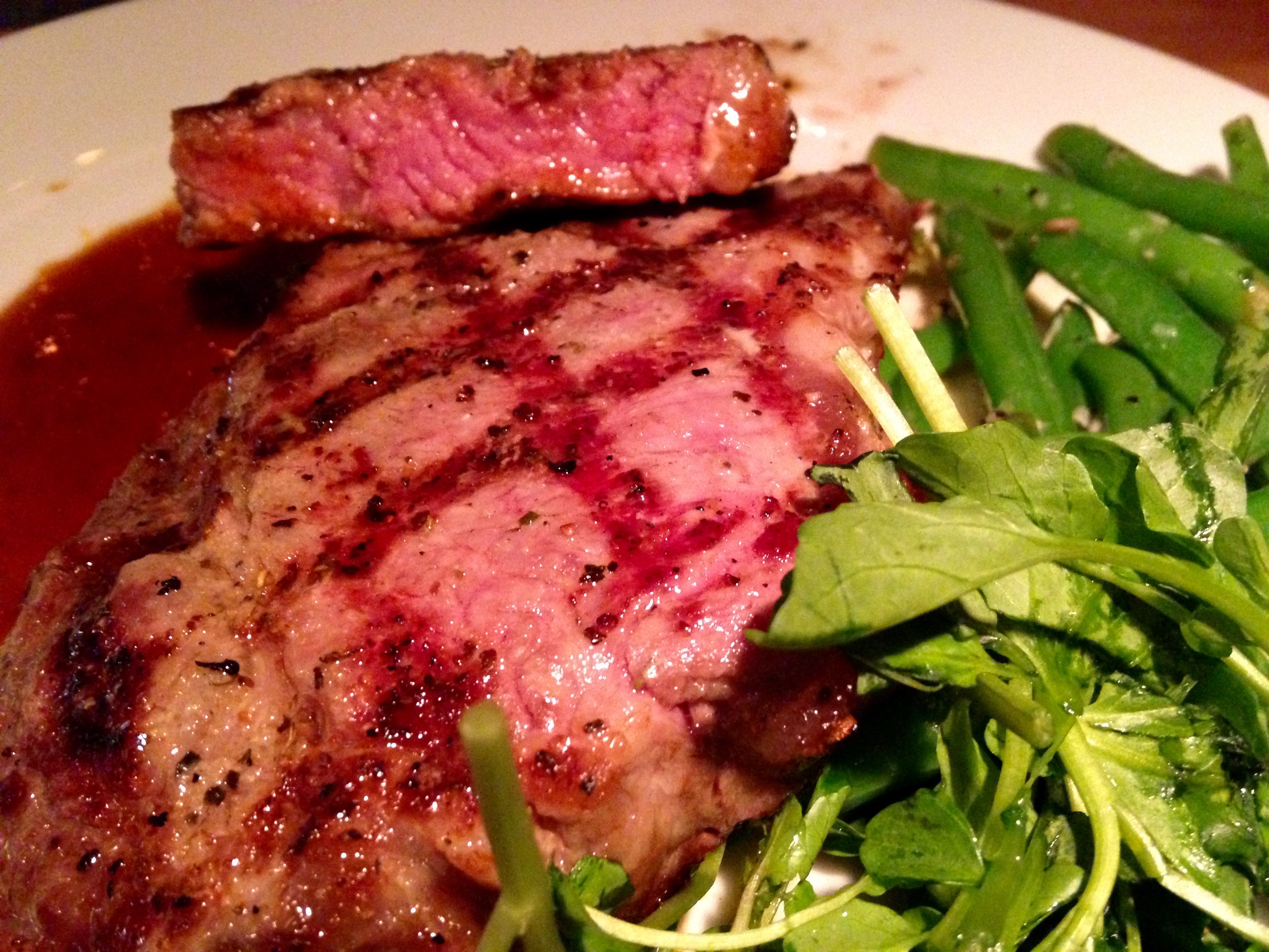 The NY strip steak is made in that hot brick oven. It probably didn’t take long to grill. It’s a beauty, and there’s plenty of meat here. In fact, some comes home for lunch the next day. The prime rib is just as gorgeous.