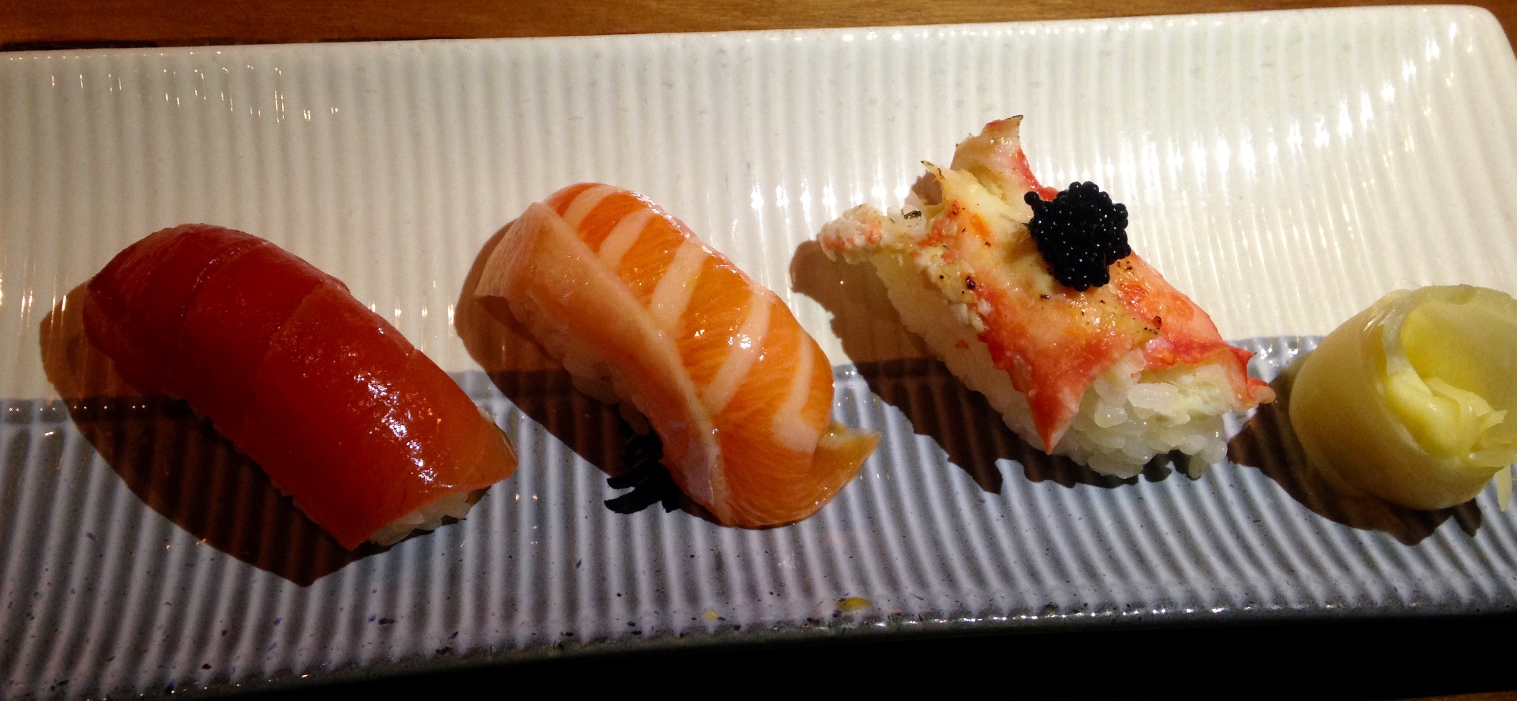 Tuna, salmon and soy butter grilled king crab grace this plate. The crab is an incredible treat. We tell them that they should offer this combo on the menu. You can probably order it if you ask nice.