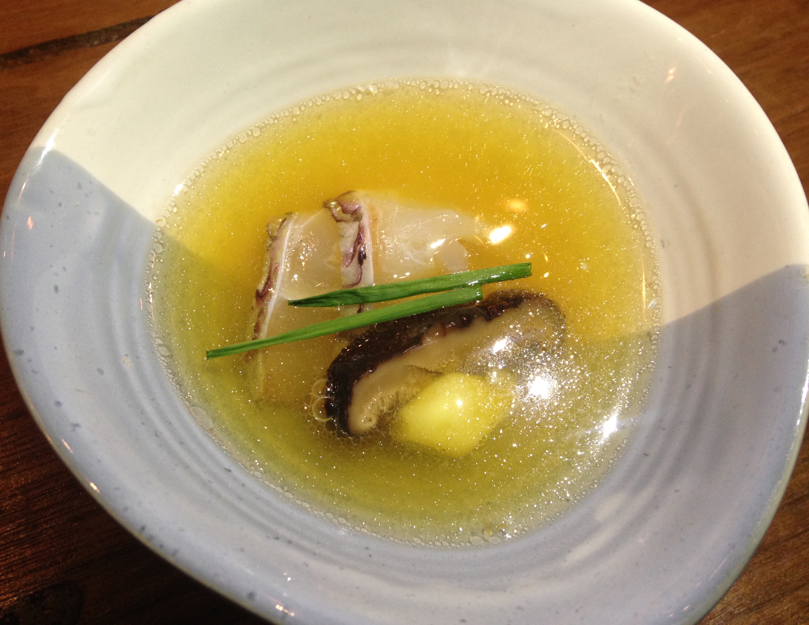 It’s a soup with a red snapper sashimi. The fish is brought in from Japan and is very fatty right now because of winter.