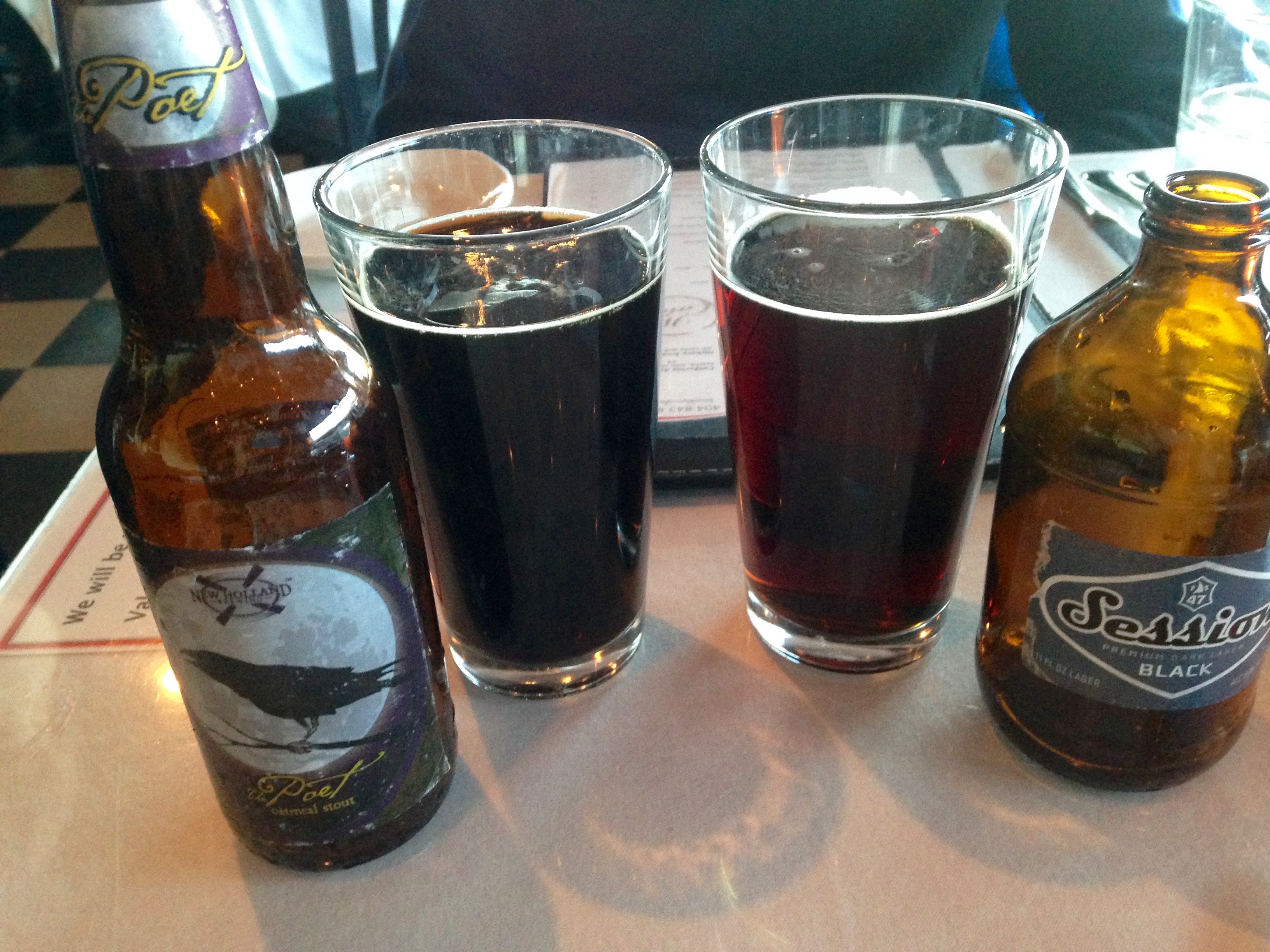 The New Holland Poet is a nice oatmeal stout that tastes a lot like the high-octane Dragon’s Milk without the bourbon. The Session is a black lager. Both are nice pours on a cold night. Did we mention we would like a beer list next time?
