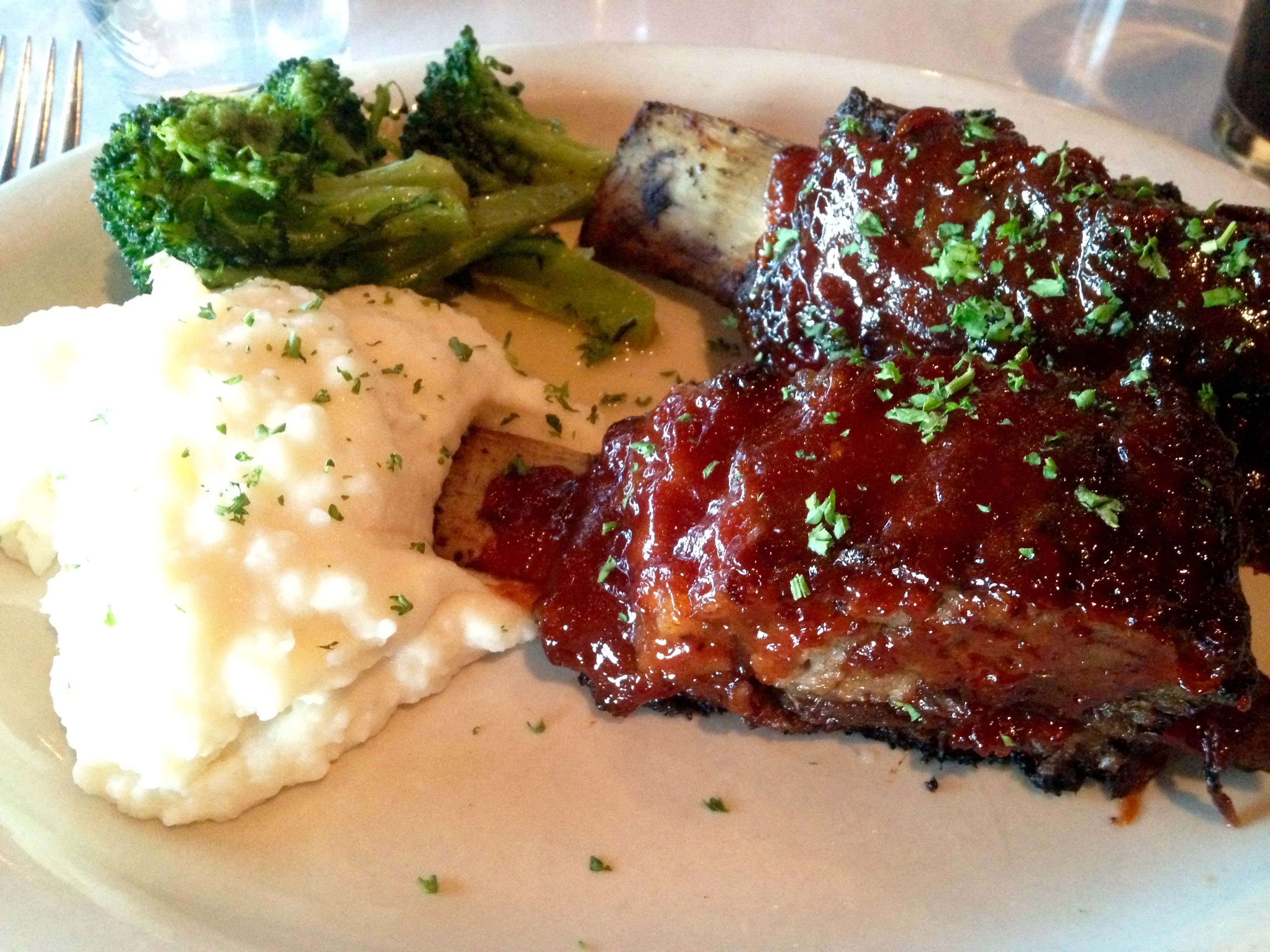There’s a lot of meat on the two ribs. It’s cooked more like a short rib with BBQ sauce. The meat is slow-roasted and very soft. The sides are mashed taters and broccoli. Sometimes I can eat healthy. If they don’t have this as a special, there are also short ribs on the menu that probably taste a lot like these ribs.