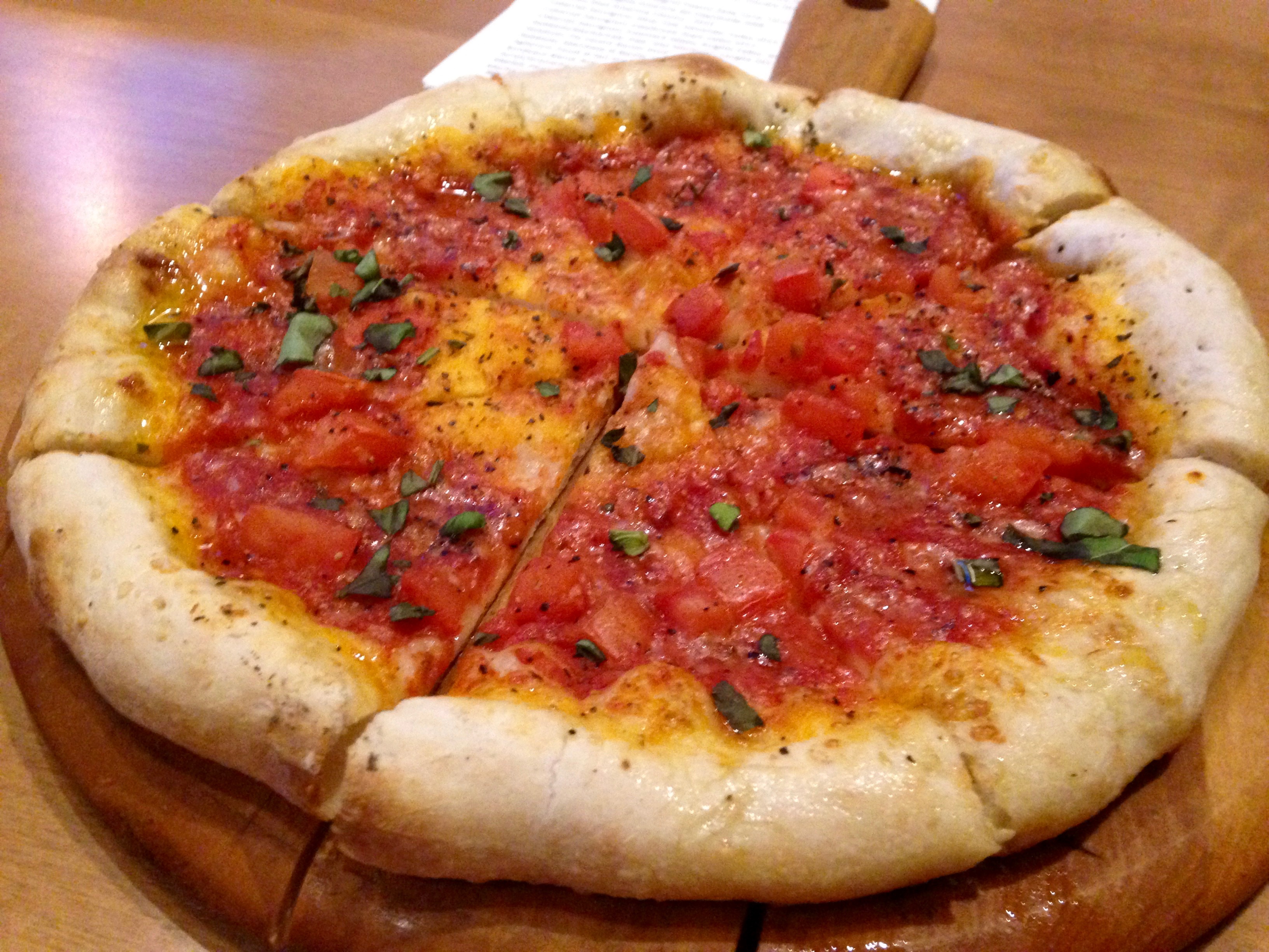 You get a little more than two glasses out of the half-carafe. Nice touch: they pour it at the table into your carafe. Look out–here comes the food. Looks like we’ll be starting from the top of the menu and working our way down. First out is the tomato basil flatbread.