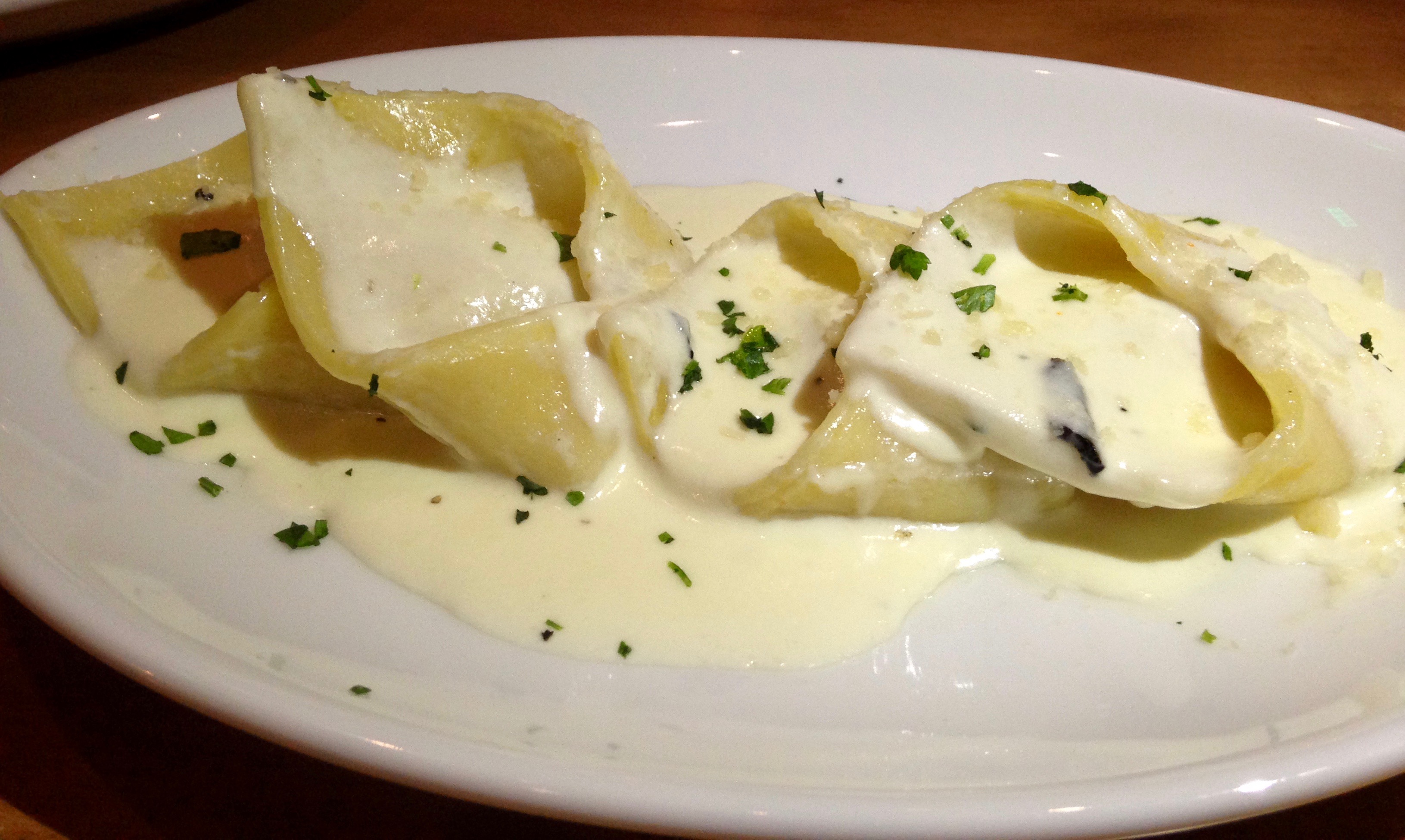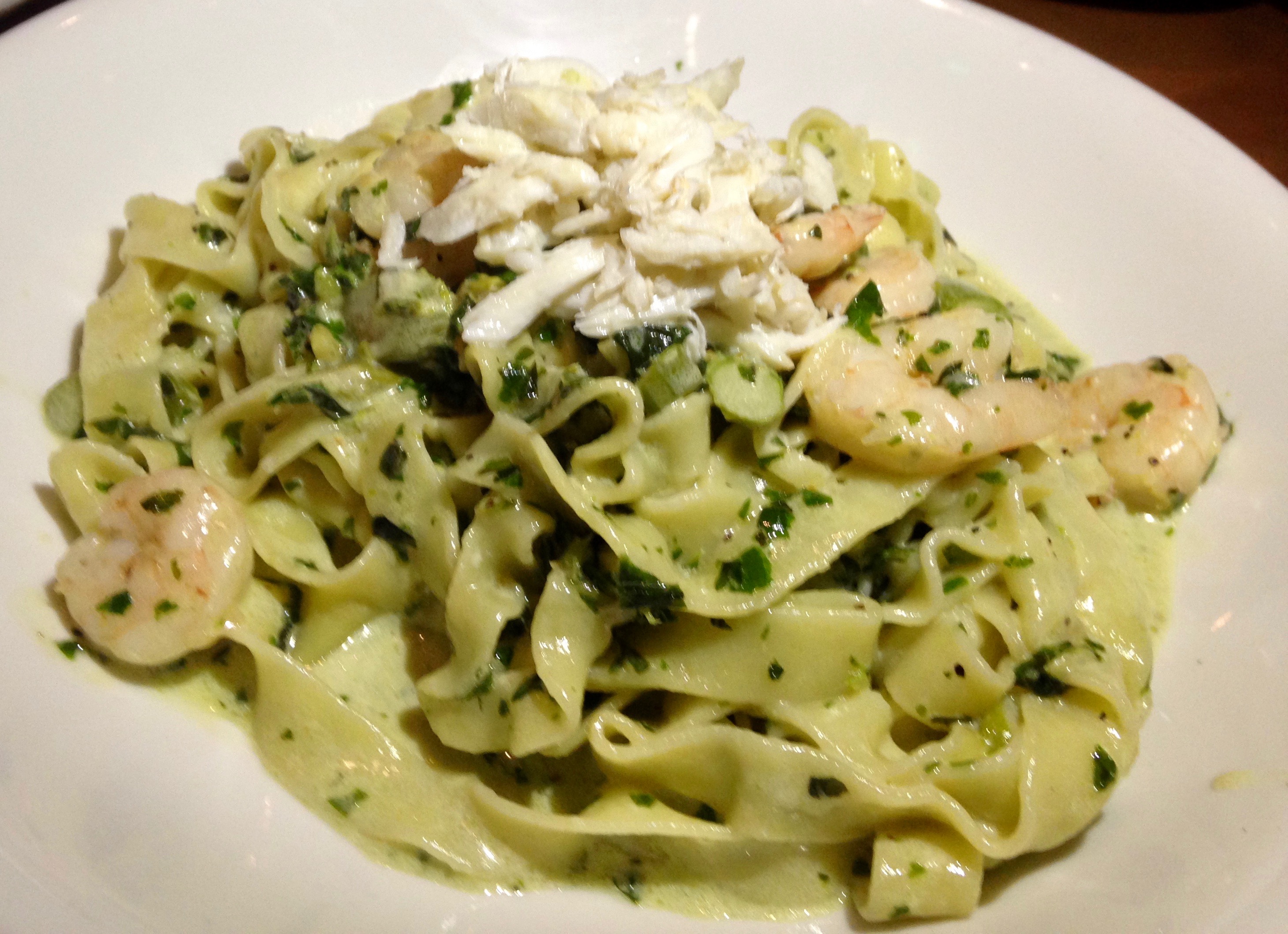 That’s crab, shrimp, asparagus and a basil cream sauce covering the noodles. Molto benne!