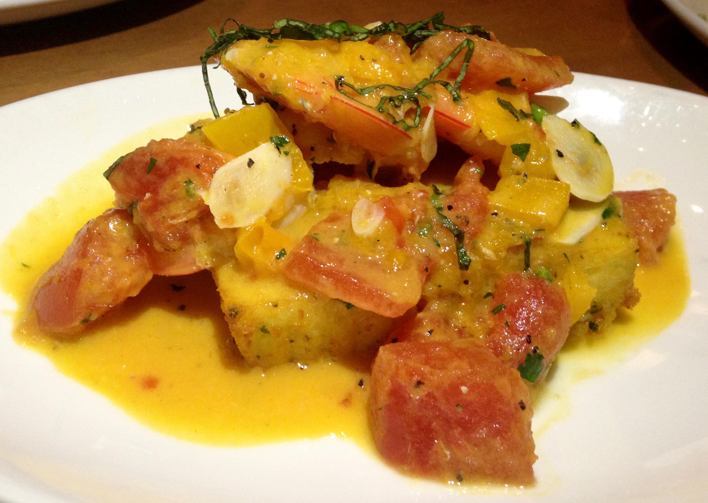 This is our first sampling of Princi’s house-made pasta. There will be more. Chewy pillows of pasta are covered with butter and parmesan sauce. These were a little too chewy and needed to be cooked a few seconds longer. Here’s Princi’s playful take on a southern favorite, shrimp and grits.