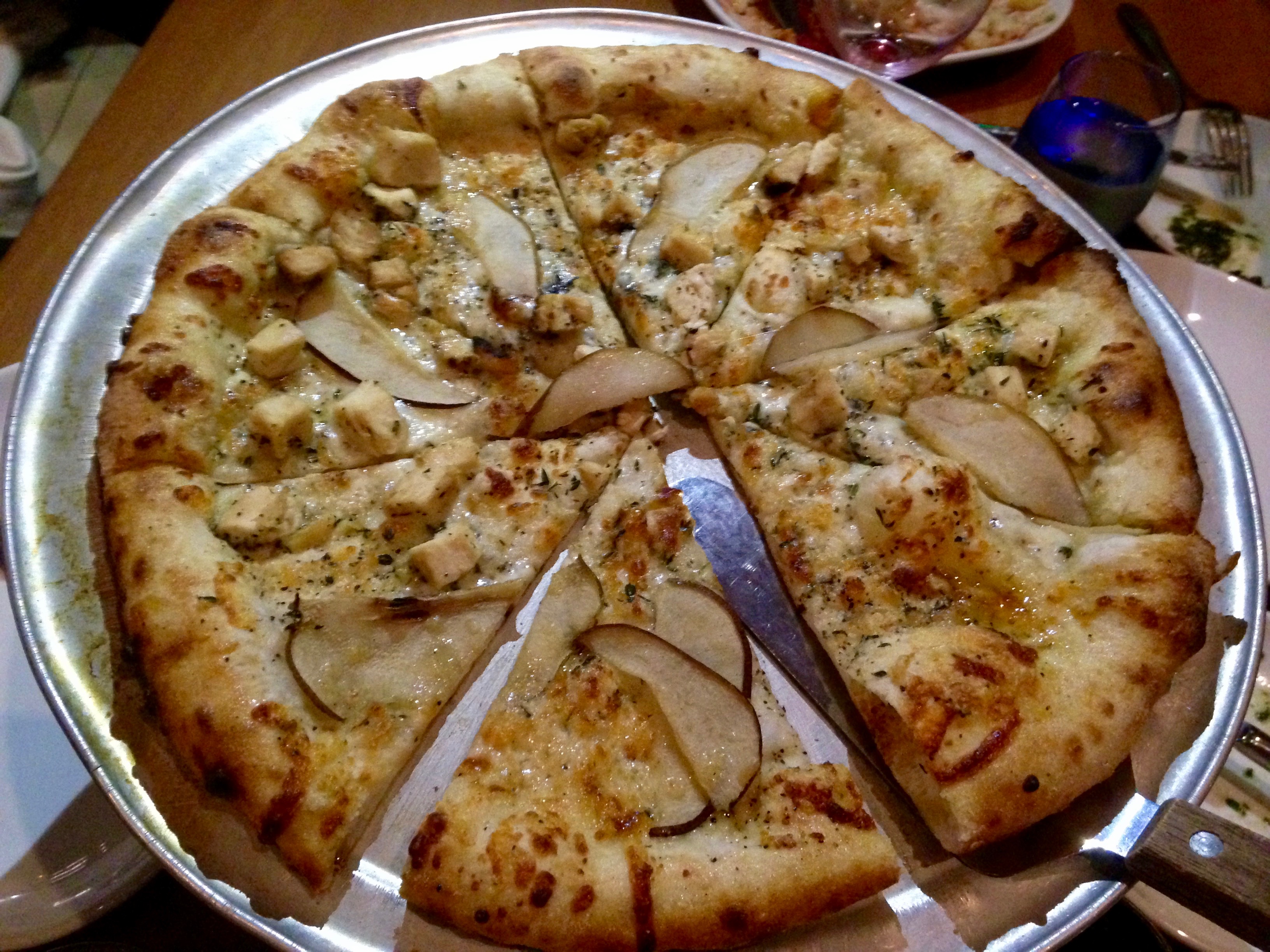 The grilled chicken pizza has caramelized onion, pear and goat cheese on top. It was OK, but you can get their house-made sausage on a pizza and we would probably like that better.