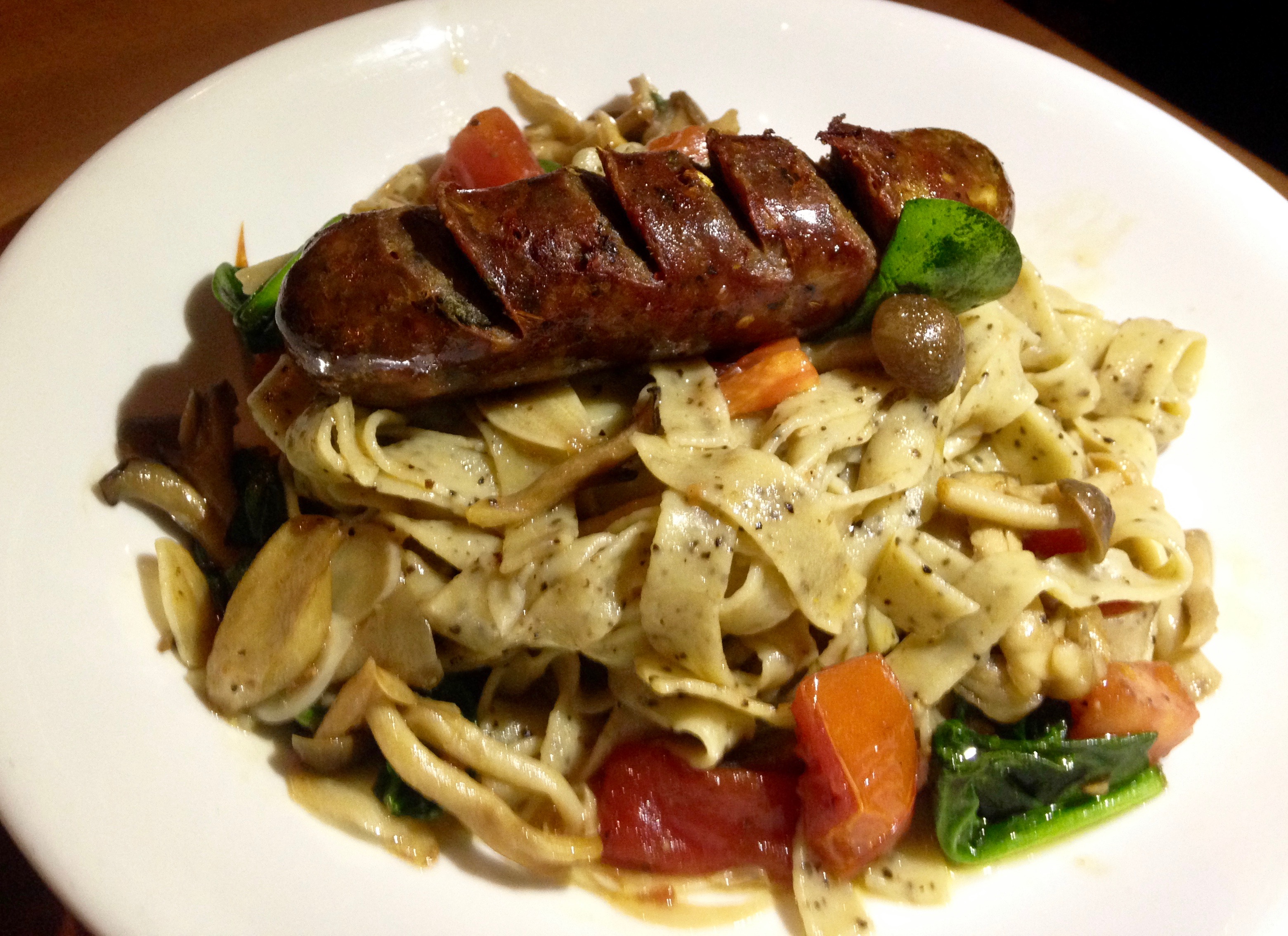 Here’s a spicy treat, the black pepper fettuccine with a whole sausage. They put the pepper into the pasta dough, so every bite has a kick. My favorite pasta of the night is the orecchiette.