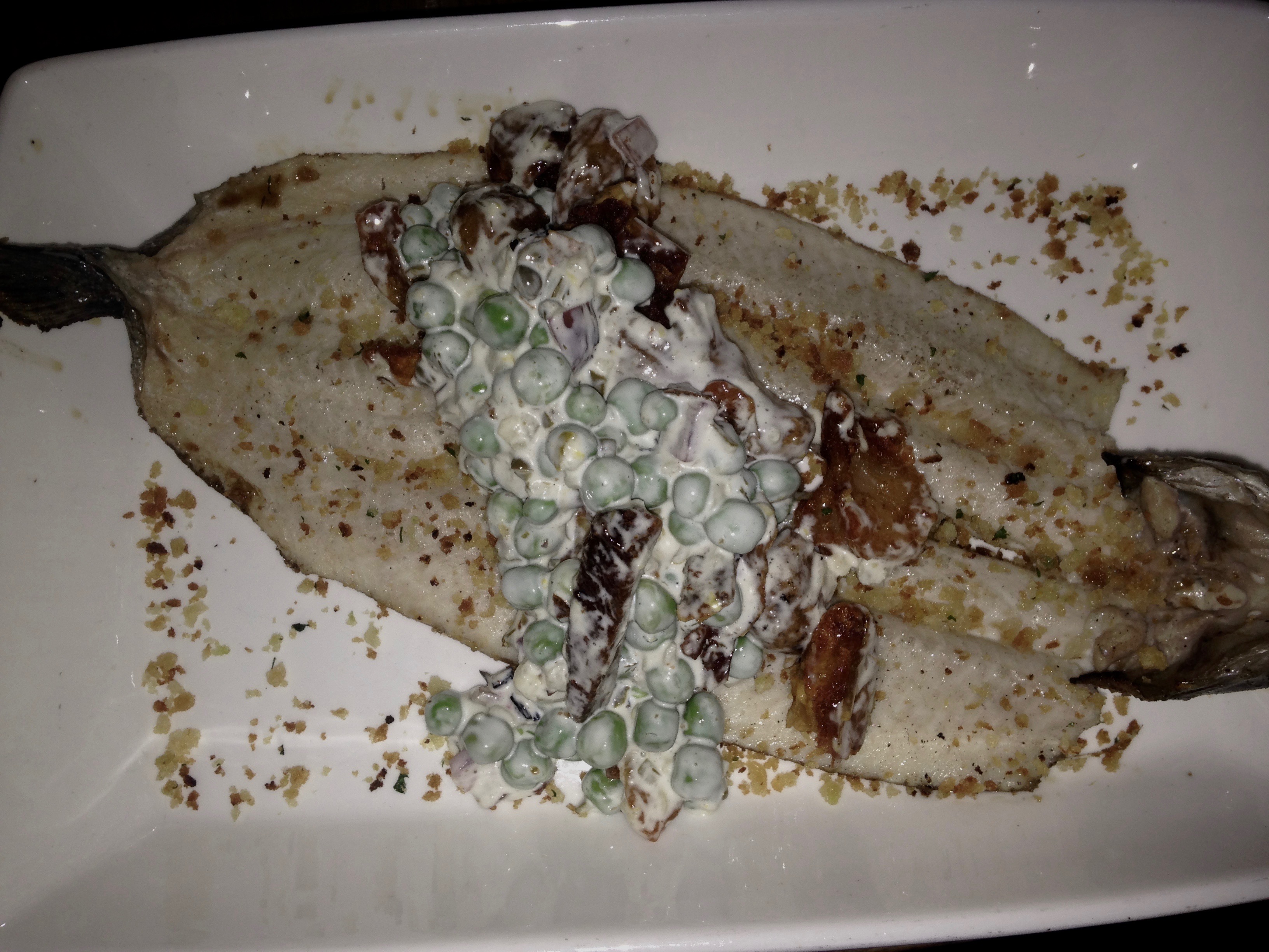 It arrives with peas and “torn” potatoes. Evidently someone in the kitchen is the vice president in charge of potato tearing. This fish is the reason she orders trout. It’s not too wet or dry—it’s just right. It’s dusted with pecans, which give it a nice texture. Eve is not a pea fan, but she likes these crispy green orbs.