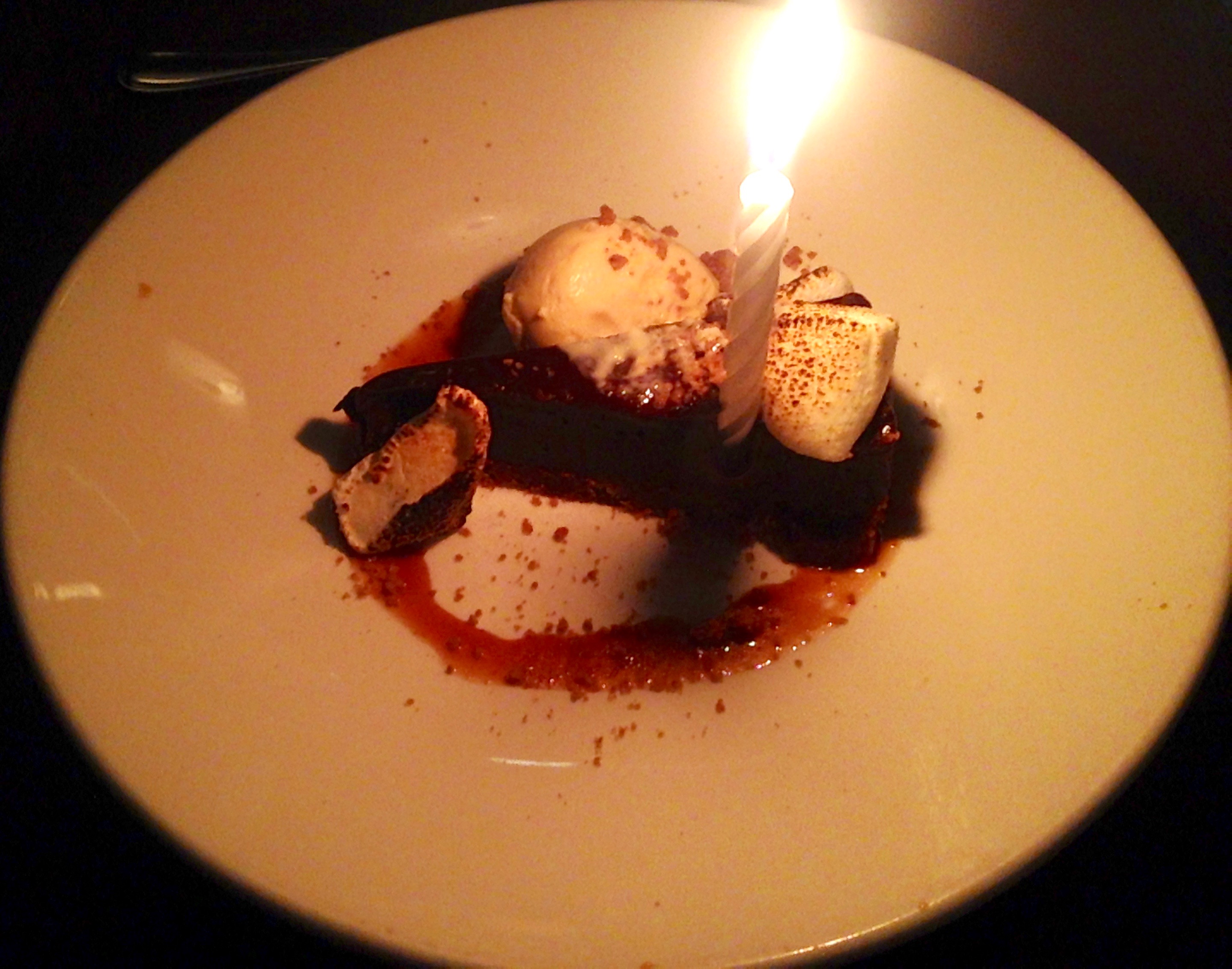 For dessert, we get a s’mores tart, a birthday candle, and three spoons.