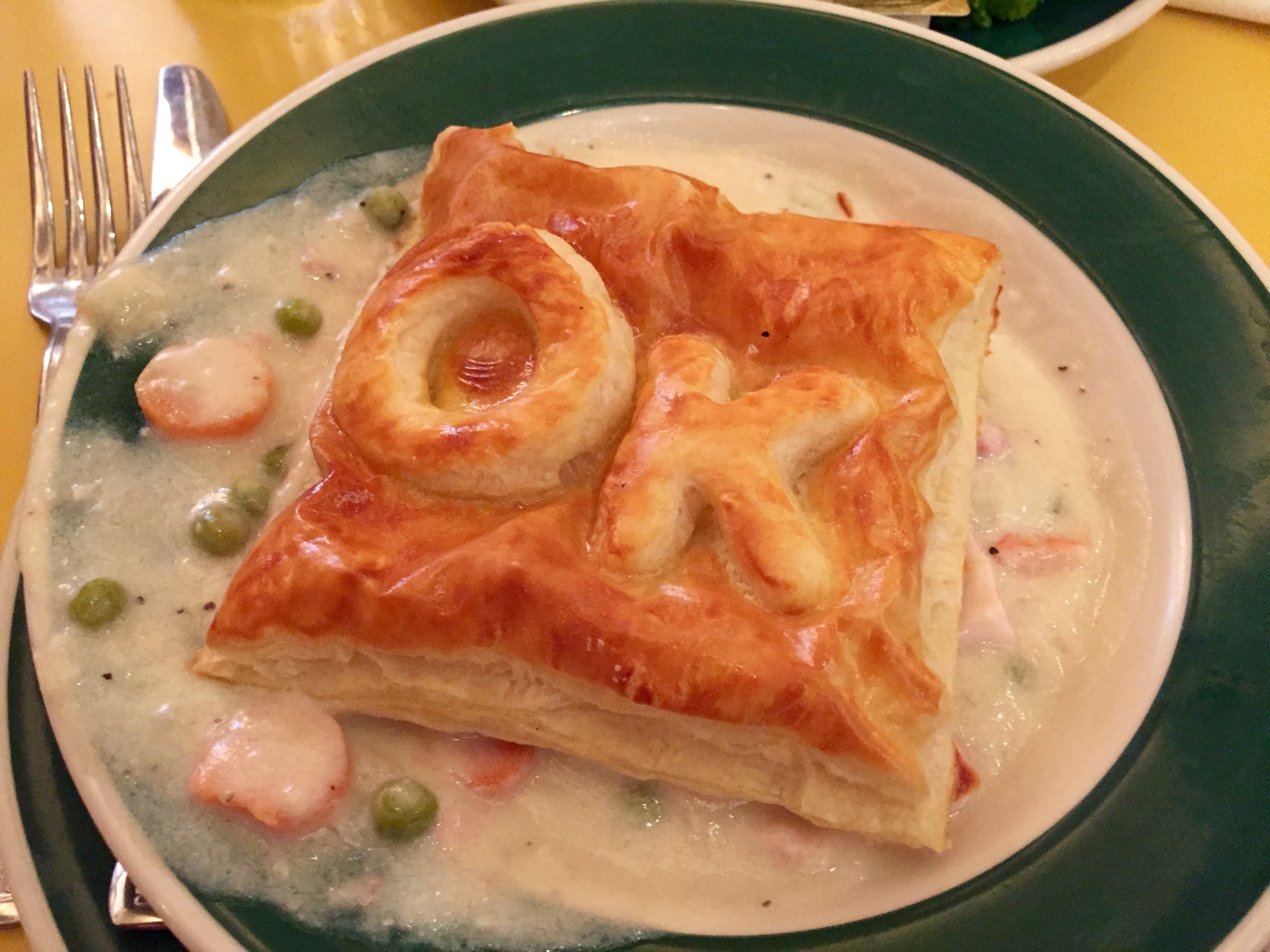 Does it really say “OK” on the top? How do they do that? The pastry is flaky and flavorful and covers a creamy sauce full of chicken, carrots and peas. You will want one of these on your table when you eat here.