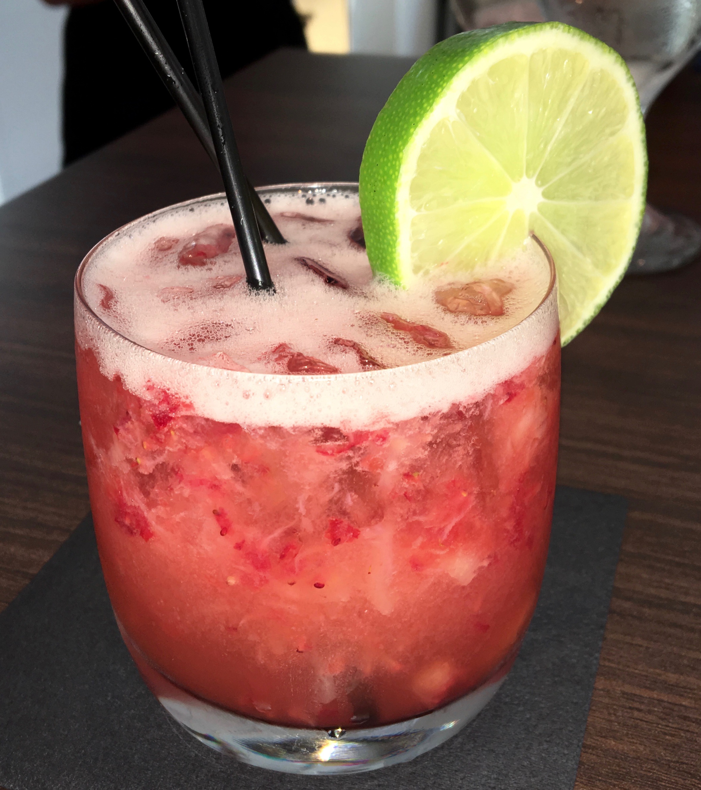 Here’s a beautiful drink, the Strawberry Caipirinha. If you can say it, you can drink it.