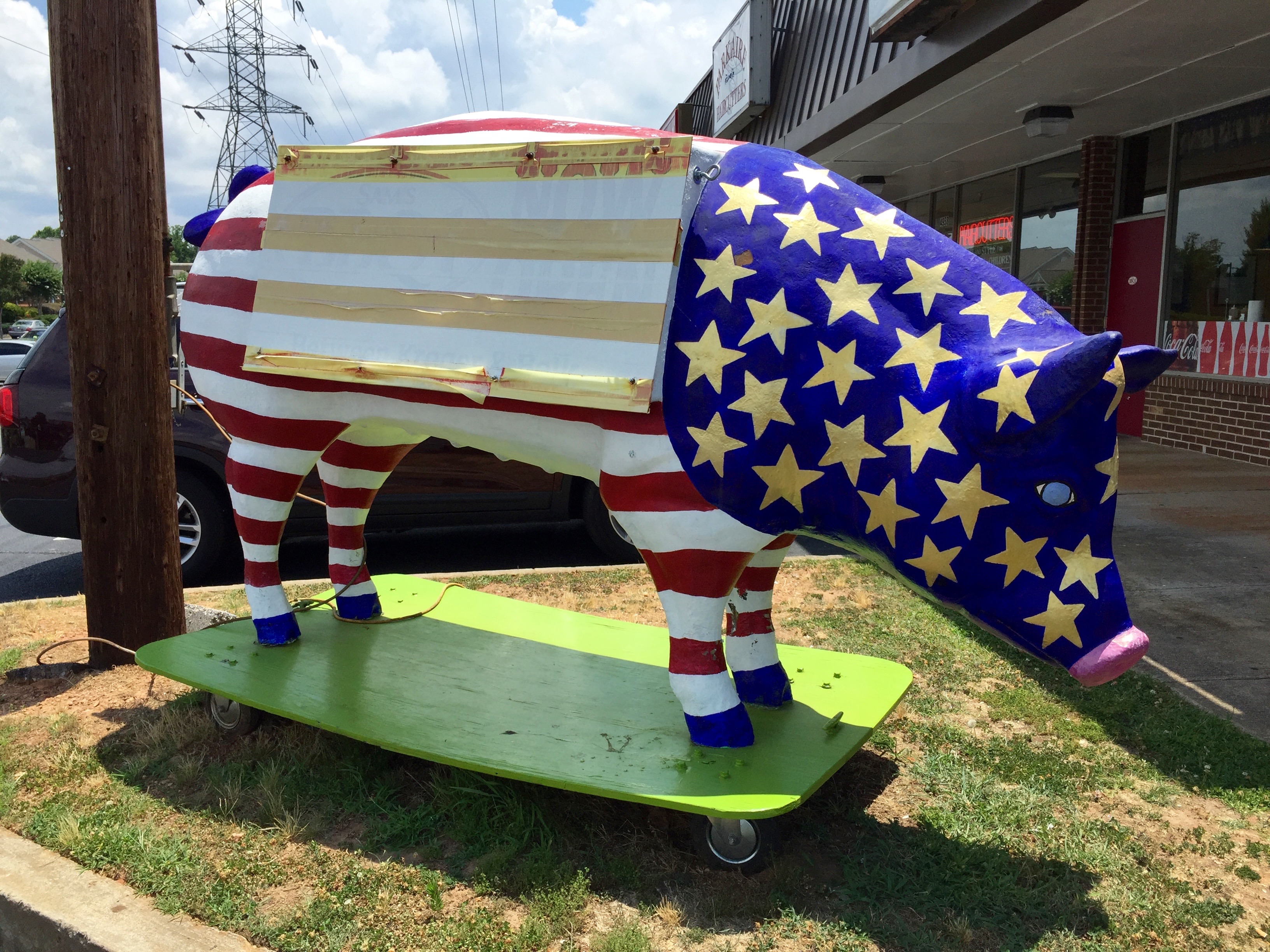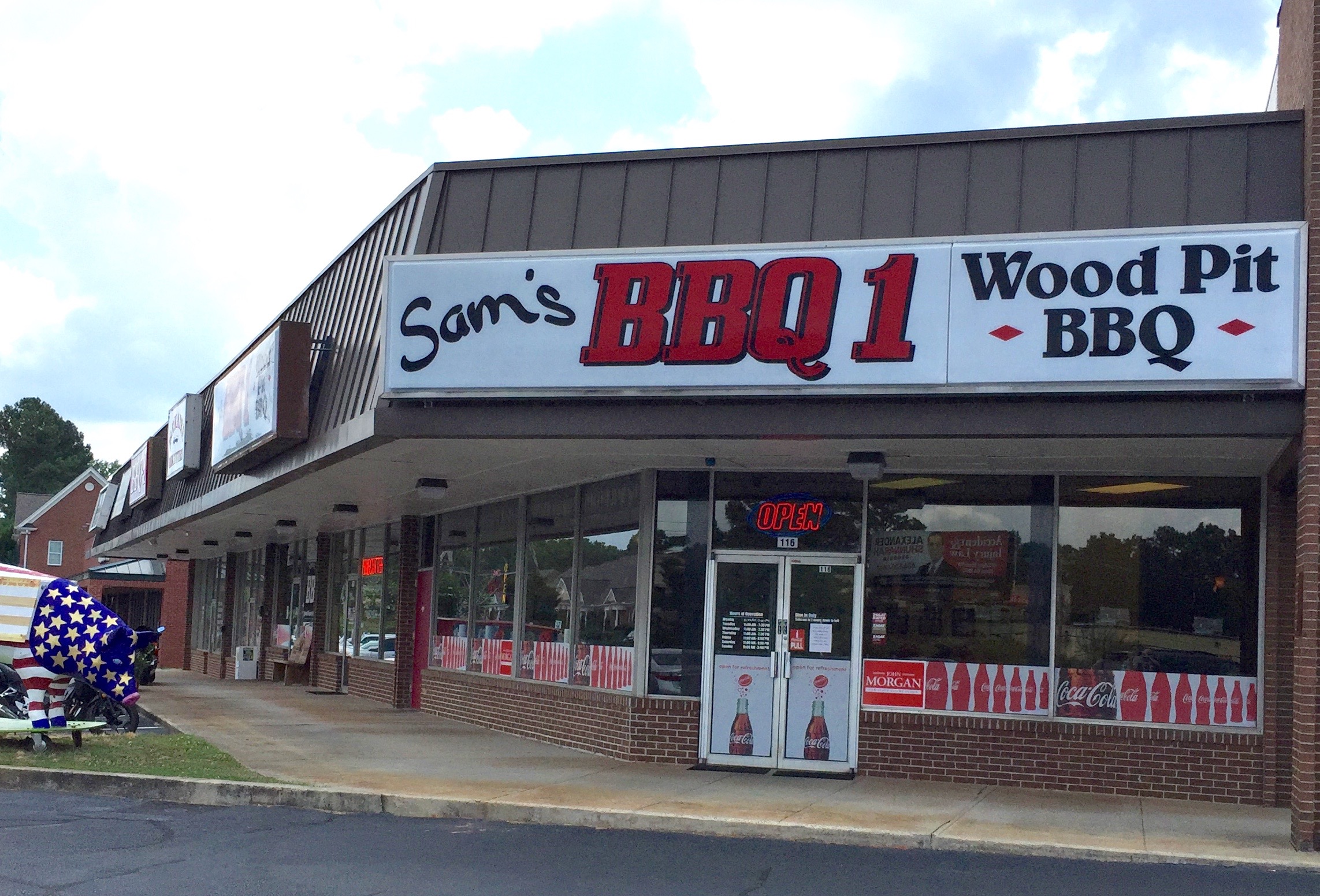 Somewhere in the “Rules of BBQ Restaurants” handbook is a requirement that you must have at least one cute pig-related sculpture or carving on the premises. Here’s Sam’s, quite visible from the road: