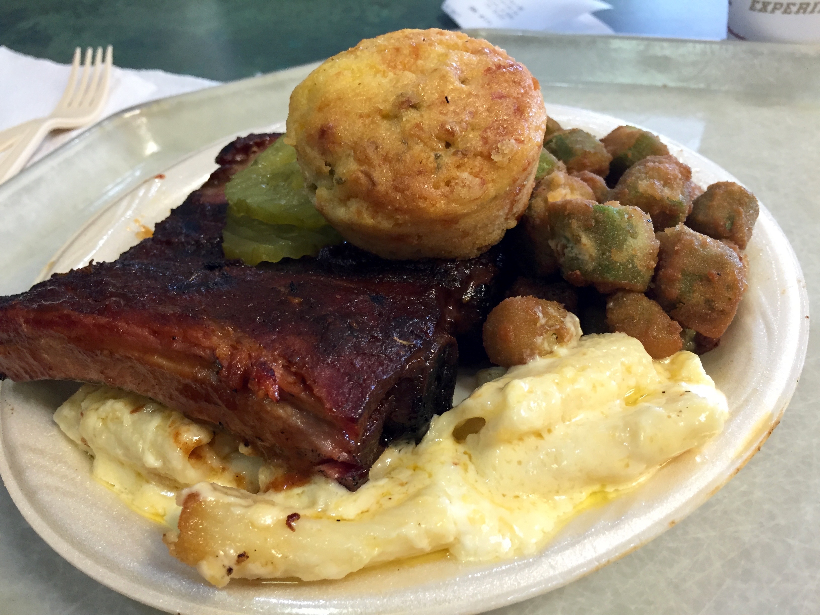These are the meatiest, juiciest baby backs this reporter has ever eaten. They don’t fall off the bone, because if they did, they would be overcooked. I add a little sauce, but it’s not really needed. The ribs stand on the rub alone. There is a lot of love in the mac and cheese, which is made with real cheese. There’s no Velveeta in sight. The okra is fresh, hot and crispy. The sides are served in their own bowl, and real plates/cups are used here.