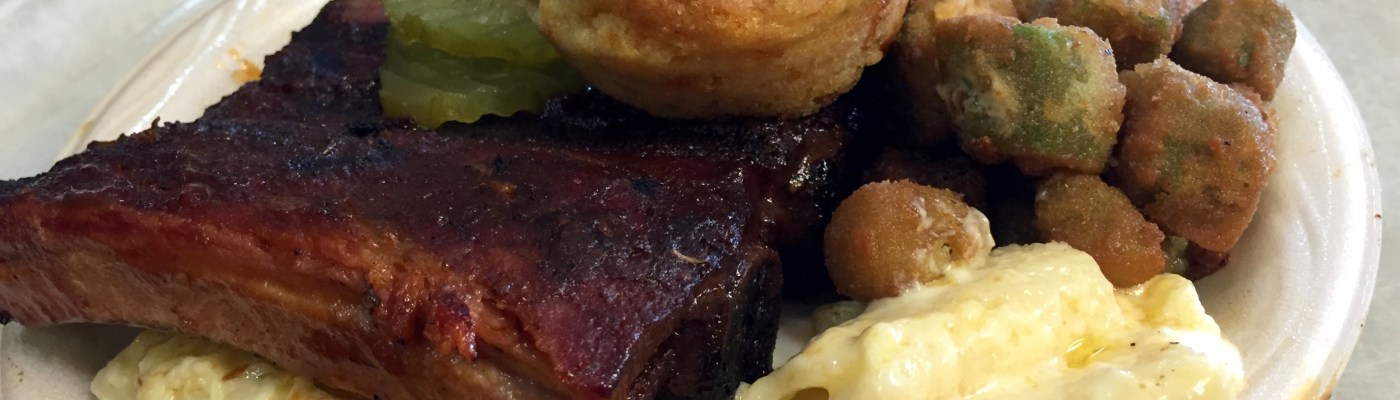 I decide to order the same thing at both places: ribs, fried okra, and macaroni and cheese. I judge a BBQ place by its ribs, and the best time to get the ribs is at lunch. They tend to be overcooked later in the day, so order them at lunch and enjoy responsibly. I prefer St. Louis ribs over the baby backs, but Sam’s does not serve St. Louis ribs. I get baby backs there.