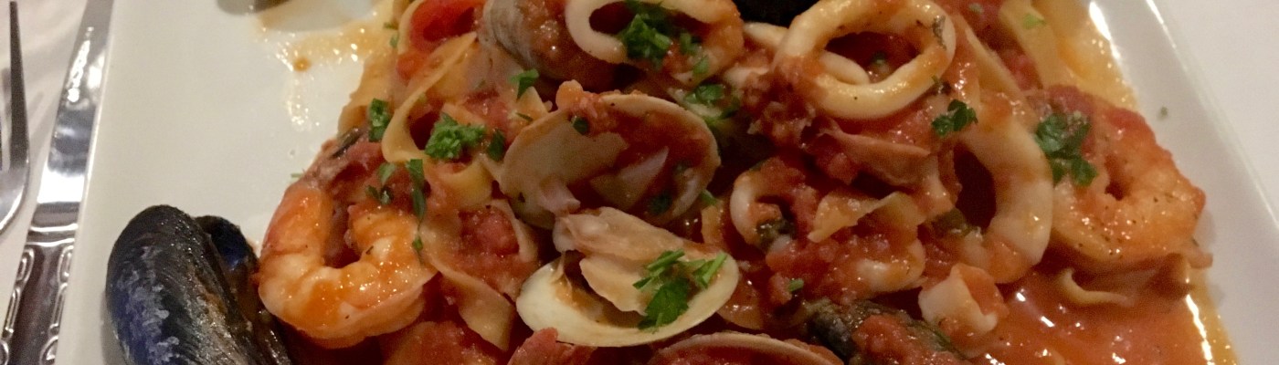 Linguini and clams is Eve’s go-to Italian treat. It’s pretty similar to my dish, but she does not get as much of a variety of seafood. This is another excellent plate of food.