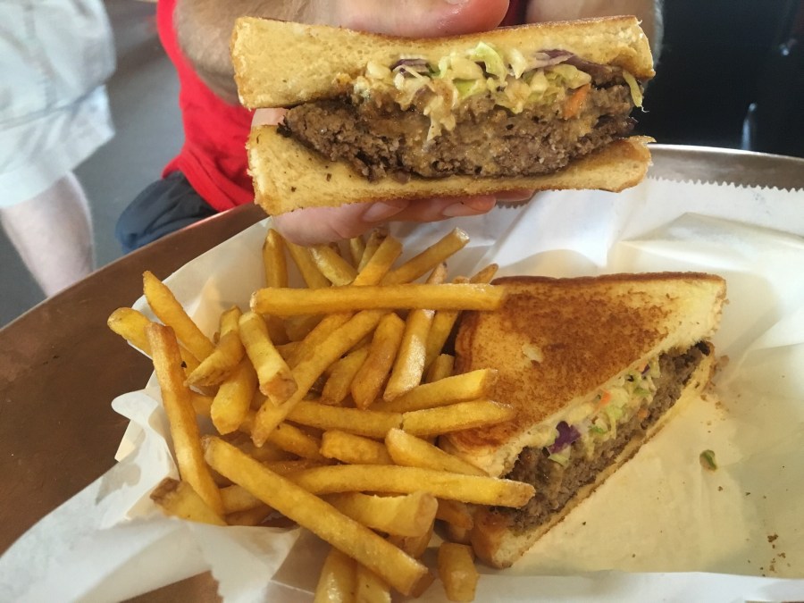 I get Jimmy’s Sloppy Slaw burger with fries.
