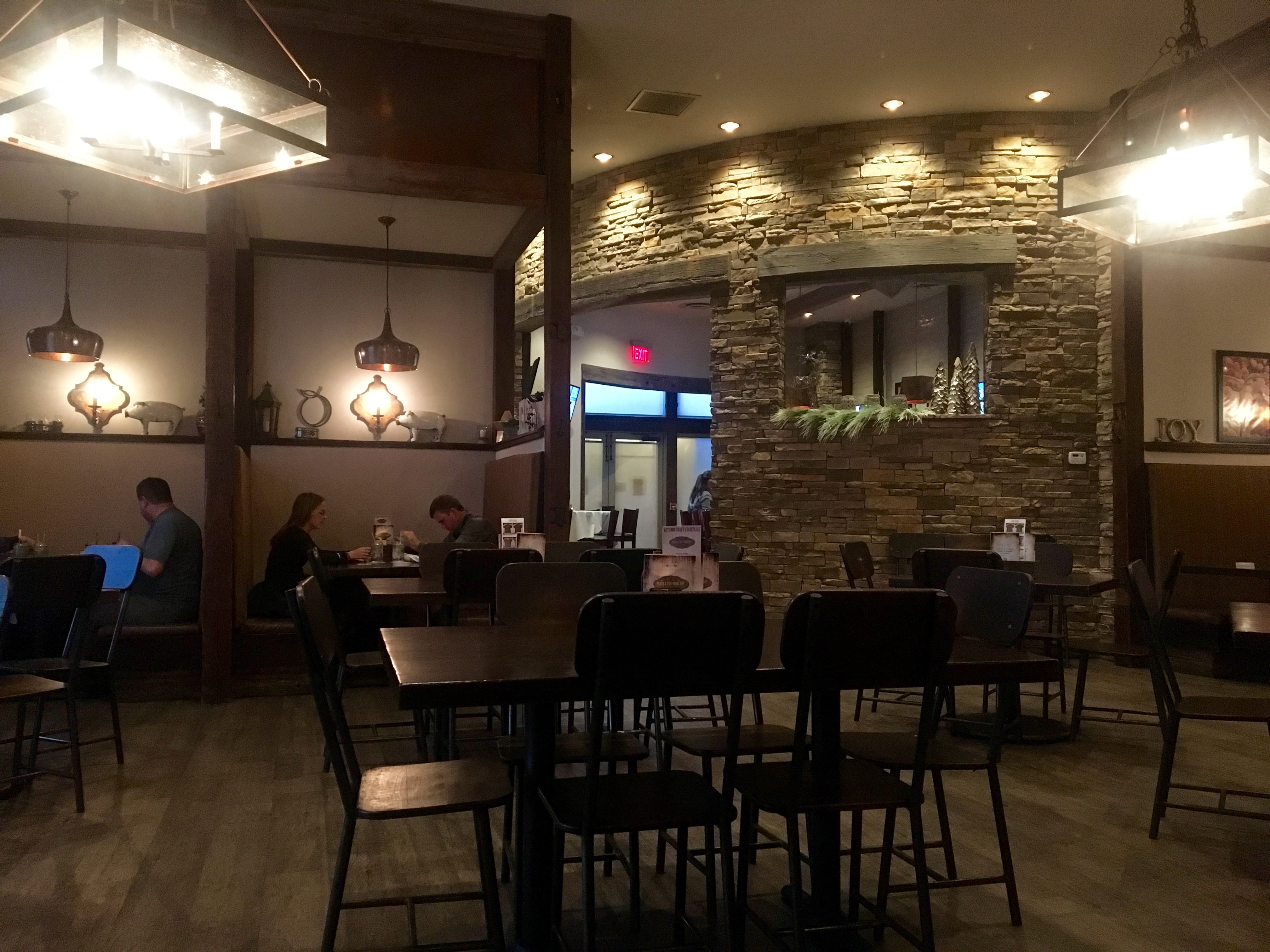 The restaurant uses a lot of stacked stone in its decor.