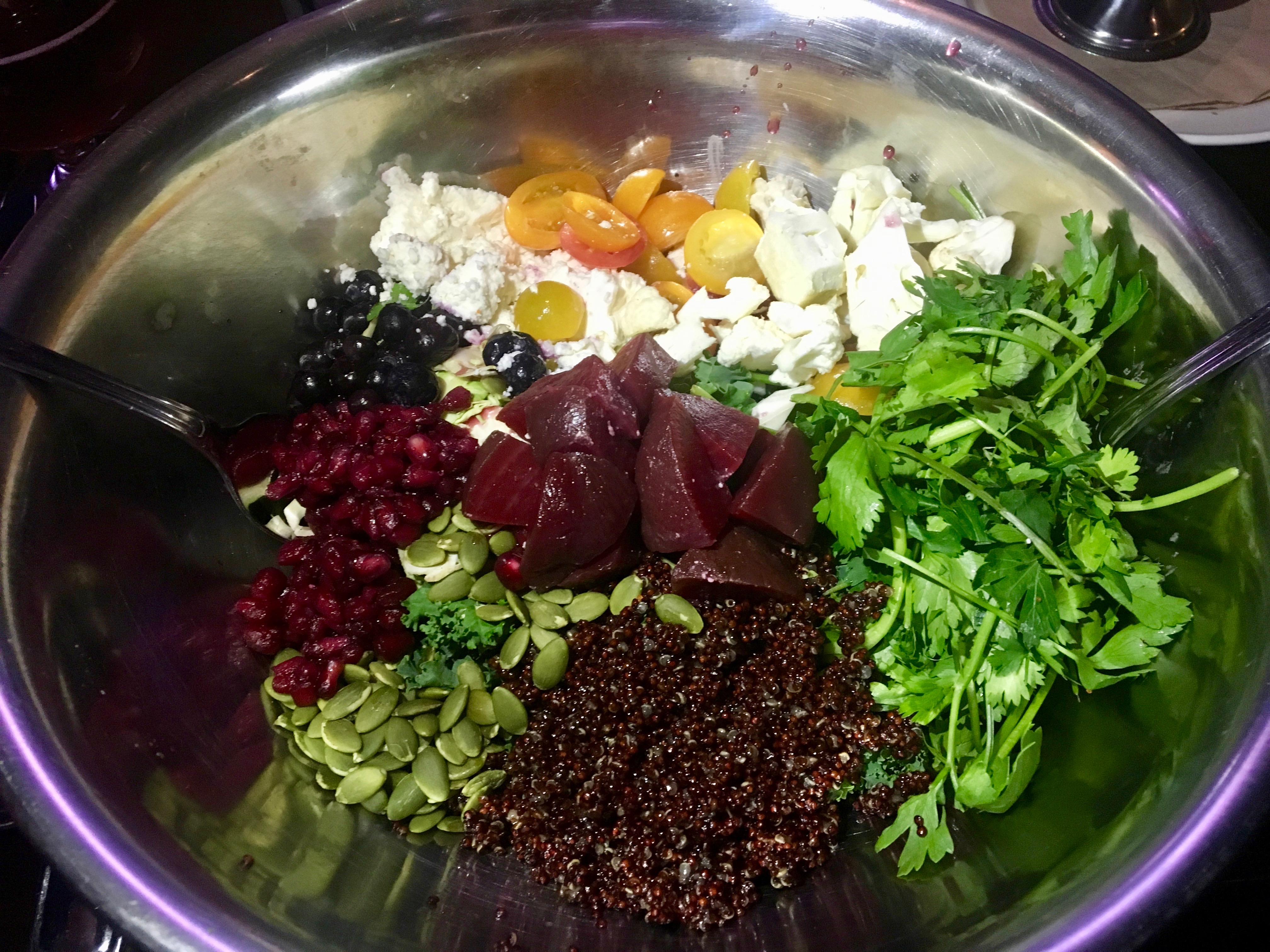 This is one good looking salad, and it’s huge. It’s so full of good things (beets, quinoa, raisins, pumpkin seeds and feta) that it almost makes you want to be a vegetarian. Not really. Lucky me–I get to help her finish it.