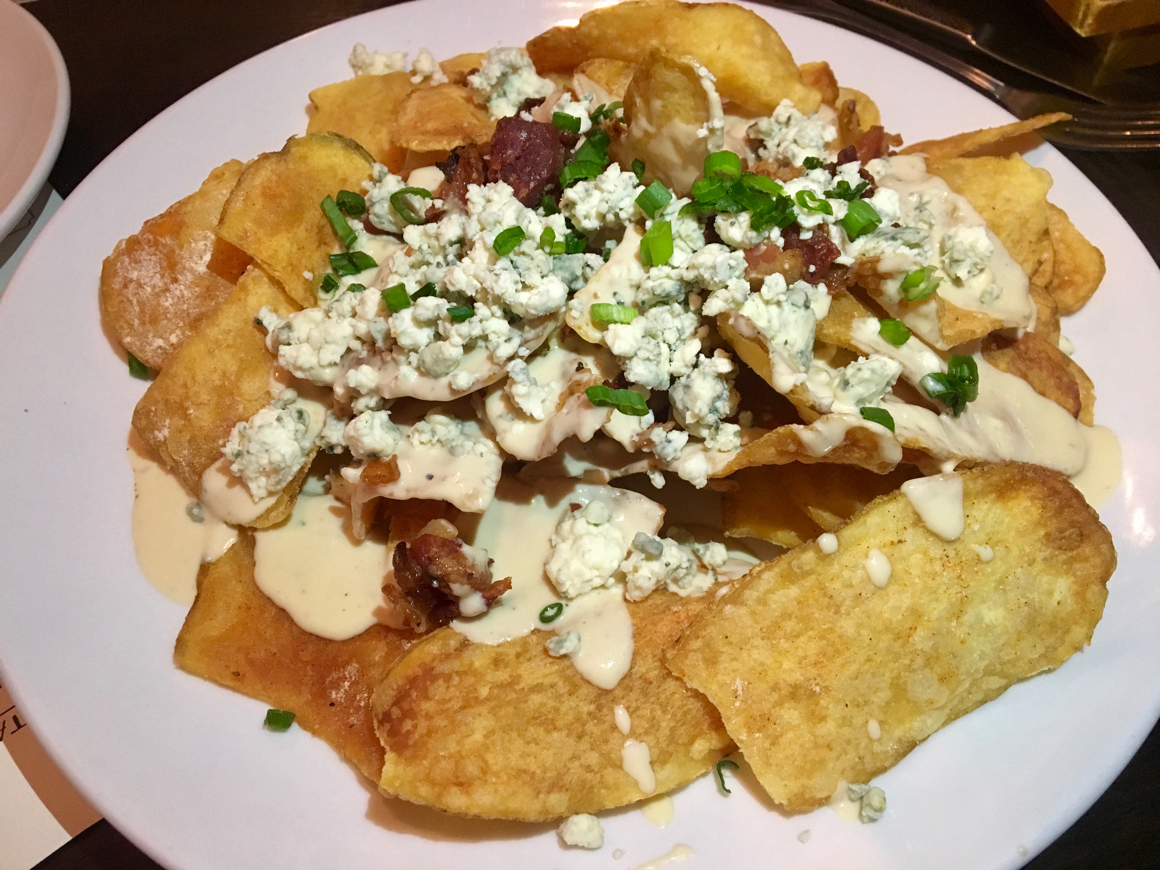 Someone in the kitchen knows how to use a mandolin. At least we think he/she does as we found no finger parts in these thinly-sliced chips. They cover them with bacon and bleu cheese, and because they are gluten-free, they must be good for you. Or not.