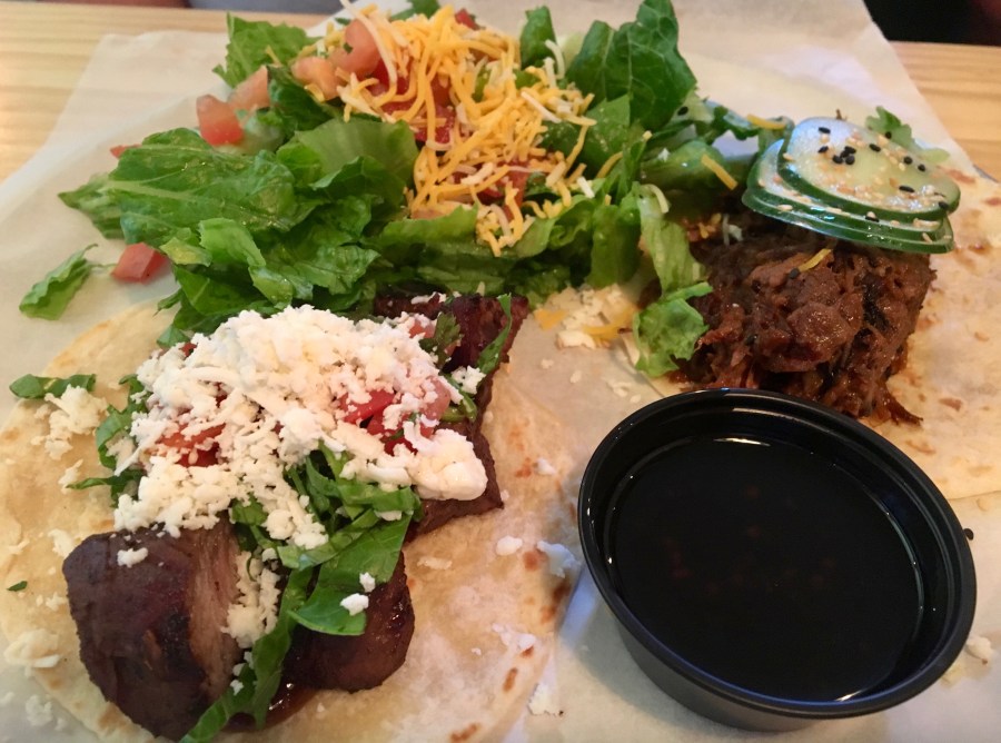 Bill spices things up with the “Rich Man” taco (filet covered in queso) to go with his beef short rib taco.