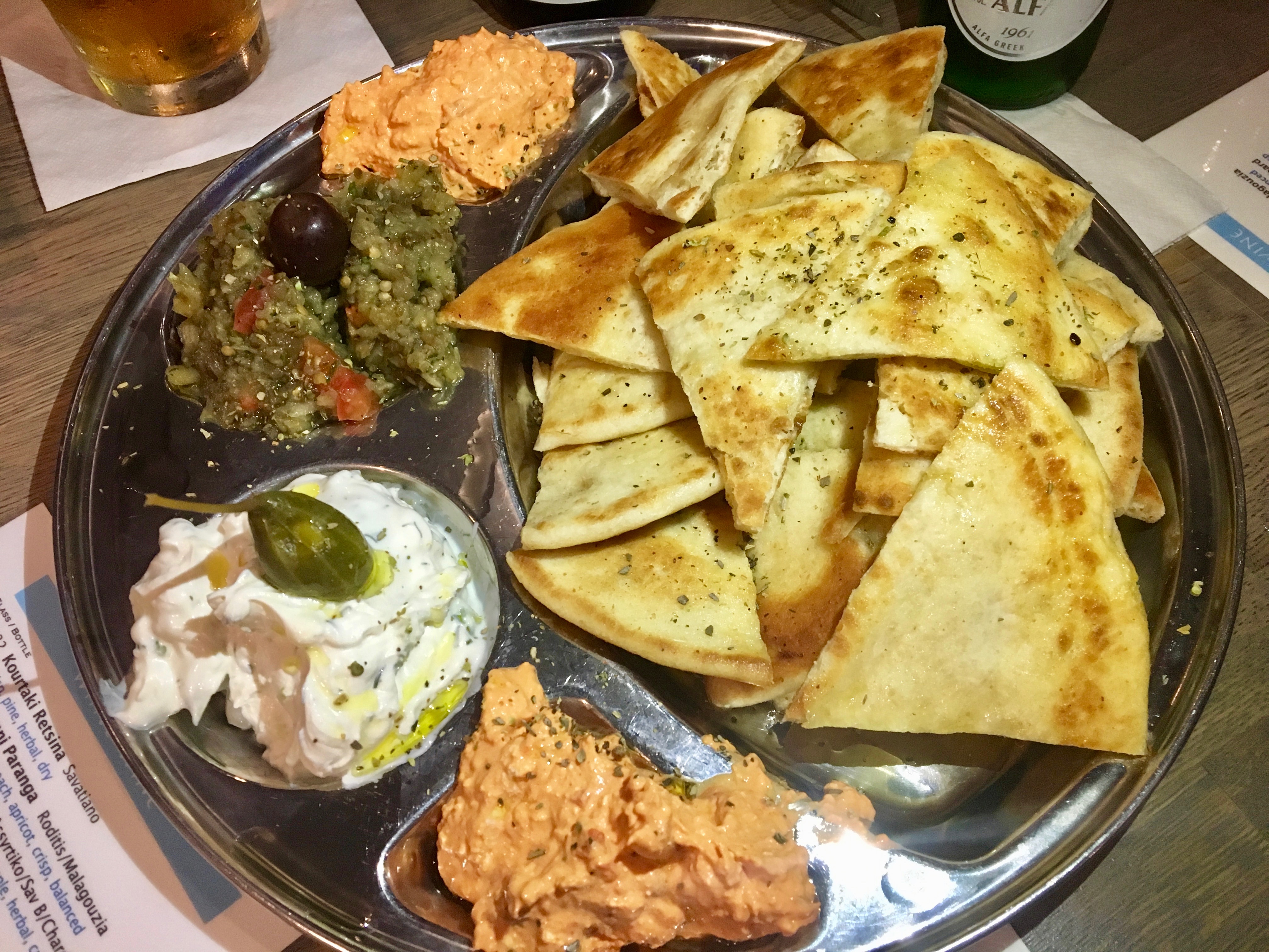 Isn’t this gorgeous? It’s got tzatziki (yogurt), melitsanosalata (eggplant) and revithosalata (hummus) to put on those pita points. I could have eaten just this and gone home happy. But wait, there’s a lot more.