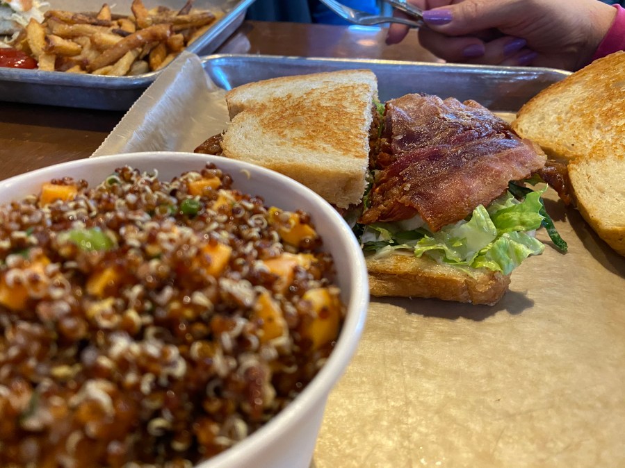 There’s a lot of bacon on this sandwich. The red quinoa side dish is delicious. It takes away some of the guilt for eating all of that bacon.