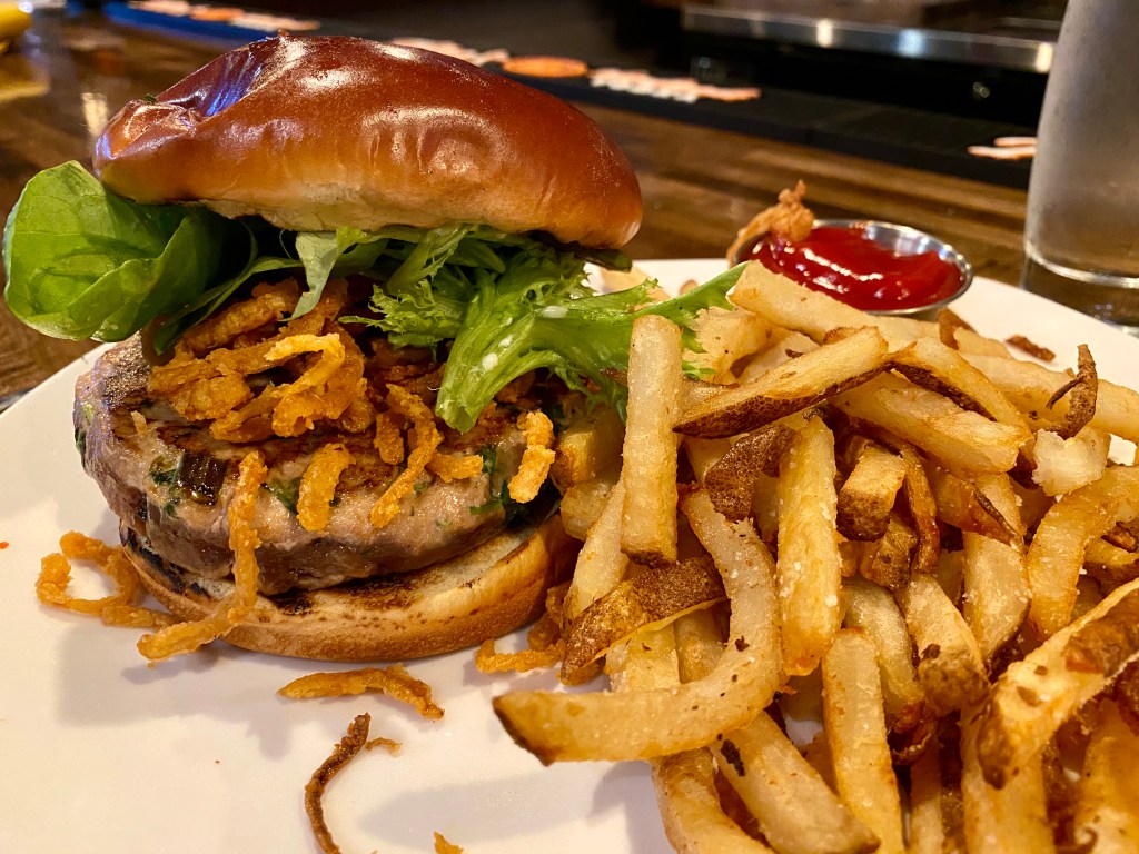 There’s nothing like a fresh-cut handful of fries on your plate. These are crispy with a hint of salt. The burger is quite good. It’s served rare in the middle and topped with crispy onions, ginger and a wasabi mayo that gives it a bit of a kick.