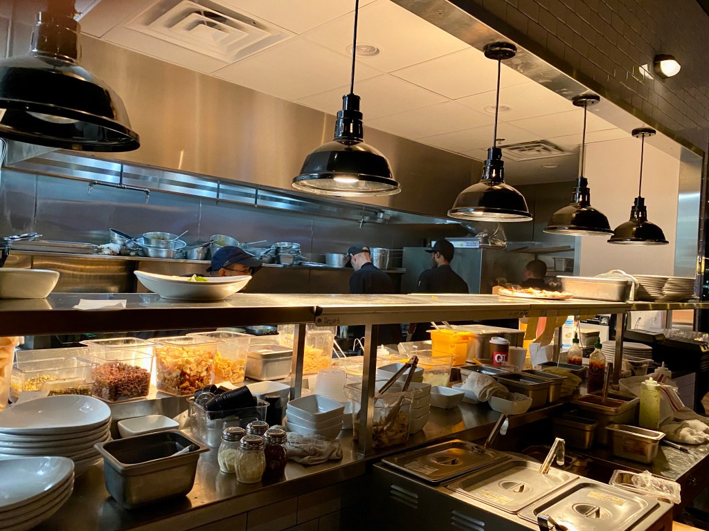 The kitchen is a hub of activity, and they are busy tonight. Menu items they are preparing include tacos, burgers, pizzas, salads, and some “big plate” items like snapper, pork chops, and steaks.