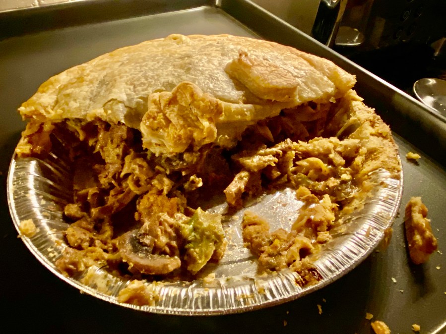 The chicken (on the left) is full of large chunks of meat, peas and carrots. The stroganoff has beef, mushrooms, broccoli and egg noodles. The chicken remains our favorite. We’ve never had a pot pie this good. It is the pie that made Paul’s famous.