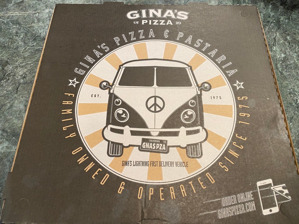 It’s Gina’s Pizza from just down the street. Gina’s has internet ordering and you pay on the internet, so there’s none of that unsanitary credit card handling in the pizzeria. Thirty minutes later, dinner is ready.