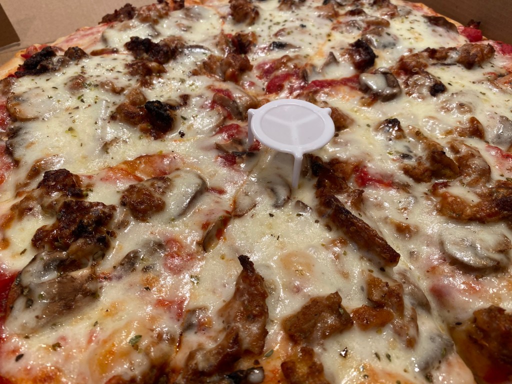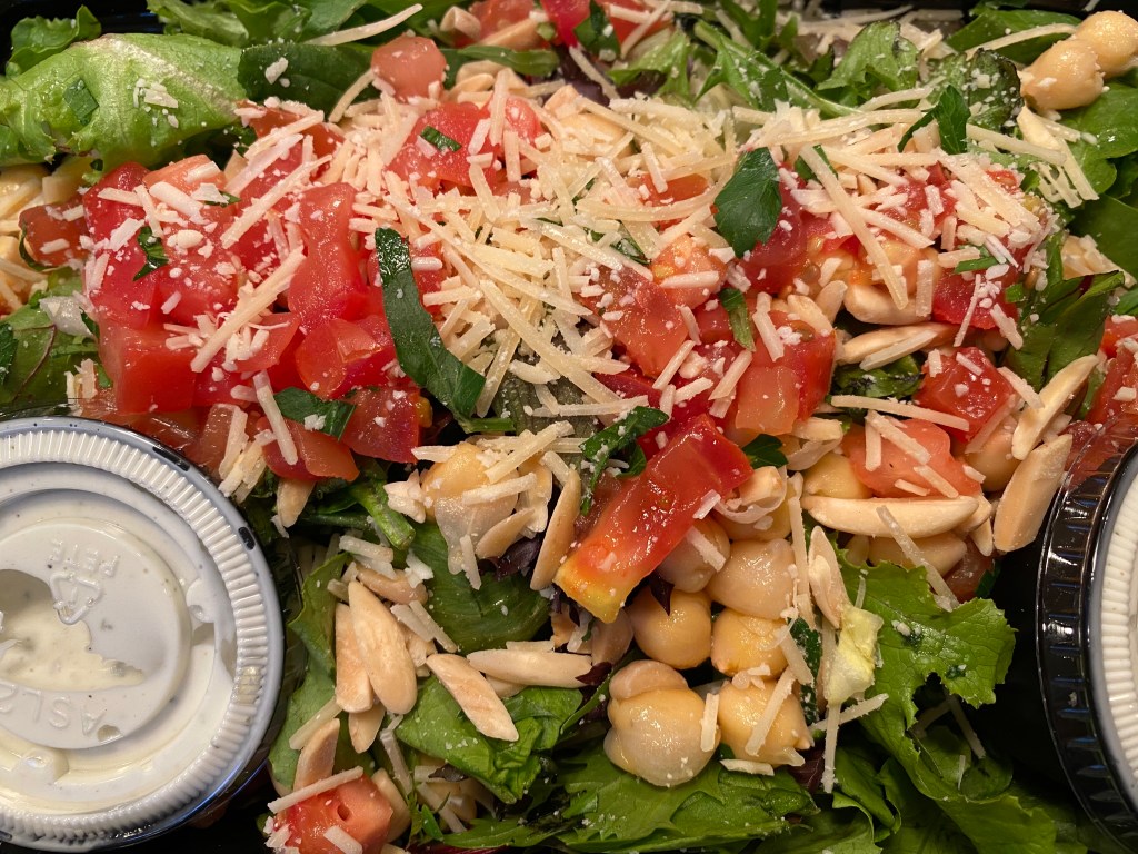 The fried eggplant and mushroom pizza is still hot when we get it home. The crust is thicker than usual, giving the pie a Sicilian feel. It’s full of cheese and you can see your cholesterol go up as you eat it. That’s OK. Pizza is one of the ultimate comfort foods, and in these times, we have earned it. To offset some of the bad, we get a salad to go along.