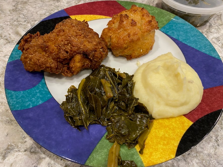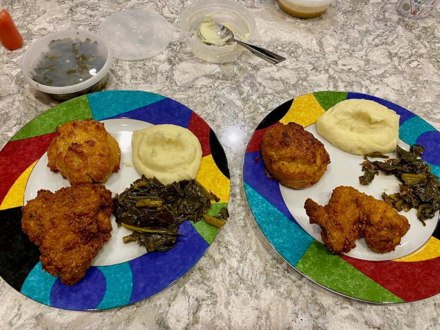 We are sure their other offerings are as good as this chicken, but this is amazing fried chicken. All fried chicken should be this good. For $25, you can feed two people and have leftovers. The chicken comes with two honey biscuits, mashed potatoes, and collard greens. Because Spring is normally an expensive, fancy restaurant that you visit on special occasions, we get out our good plates for the meal.