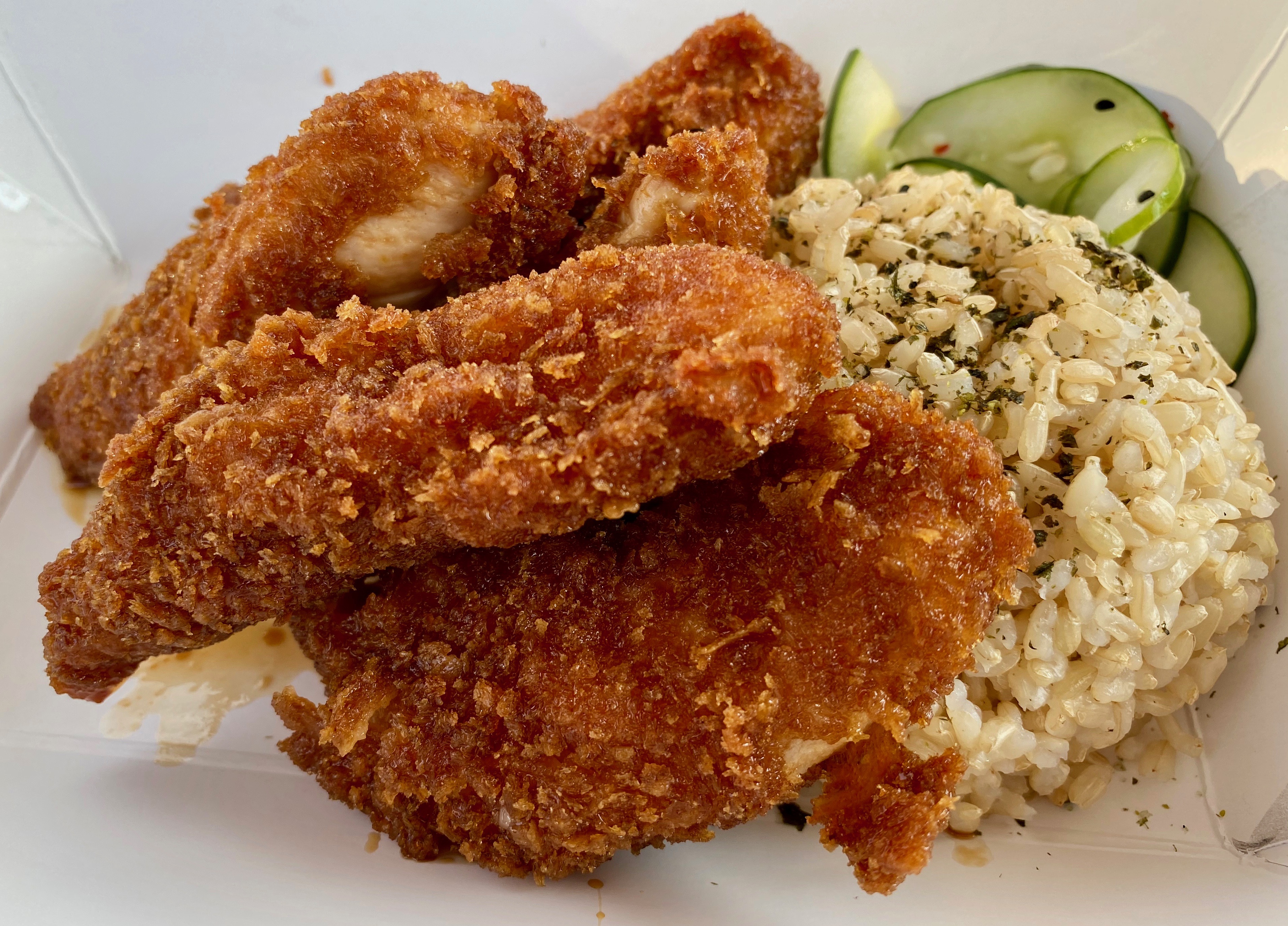 Another reason to go to the Marietta Square Market is the addition of Ponko Chicken. It takes awhile to get your food, because they fry every order up fresh. This is hot and crispy chicken. You can get it spicy, but we wimped out and got it plain. The pickled cucumber is a good way to add a vegetable to your meal.